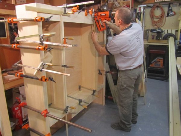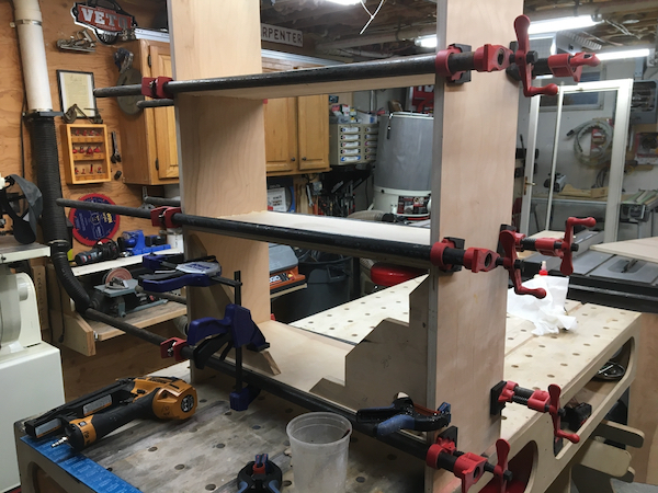 Clamping face frames or boxes that meet at ninety degrees I often use a woodworking clamp block assembly jig to keep things square and prevent racking.