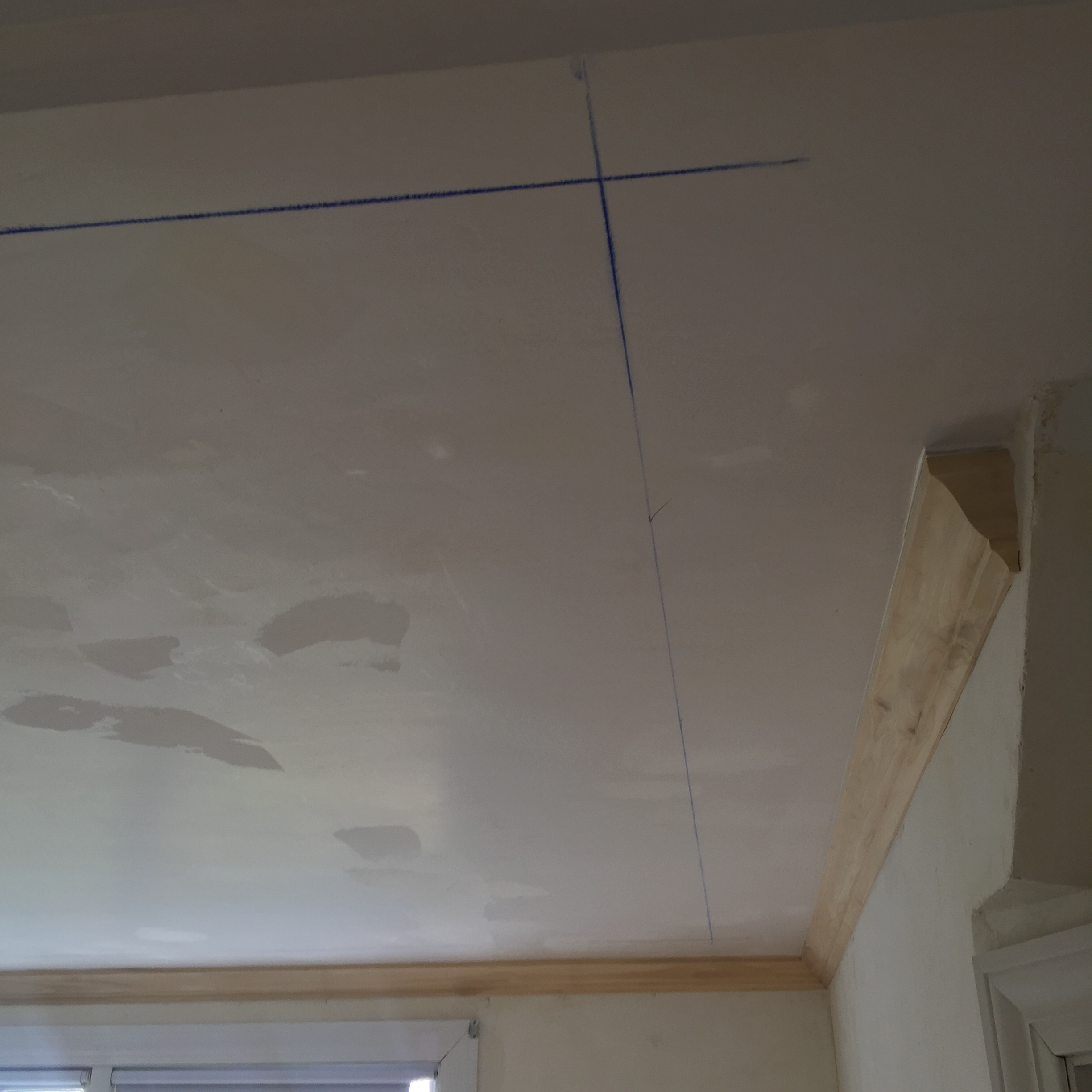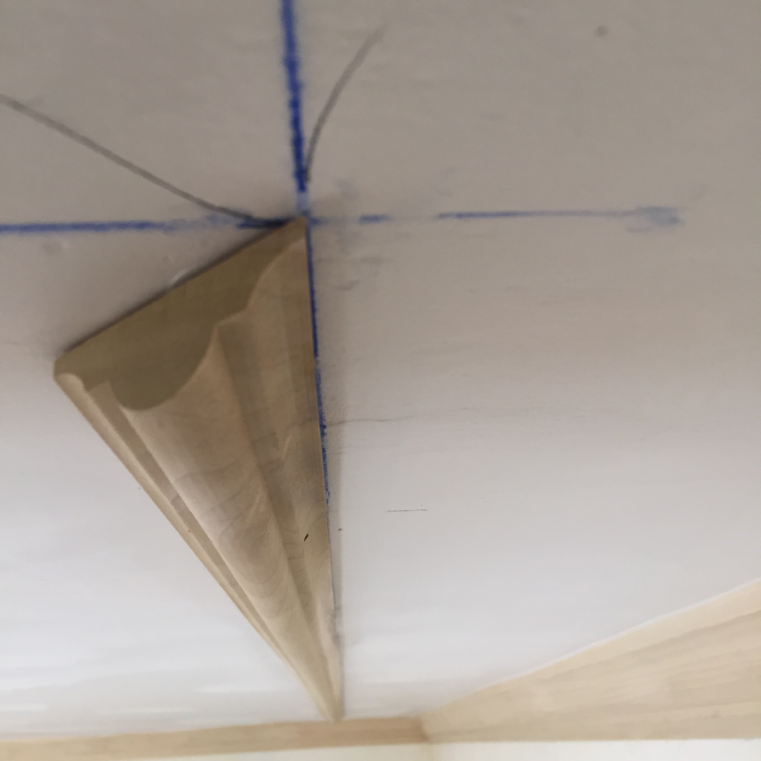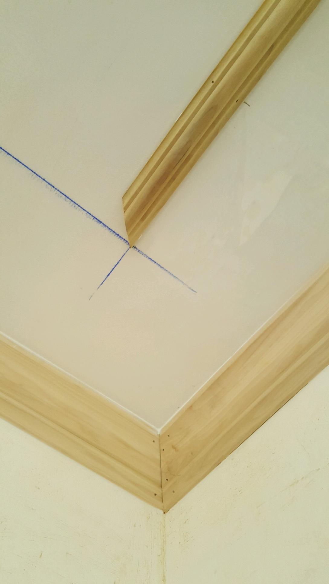 Using a stud finder and a finish nail to penetrate and confirm nailers, we located the strapping in the ceiling and marked their location. Because the strapping is installed perpendicular to the ceiling joists, we were only able to direct nail into solid nailers on two sides of the rectangular molding pattern.