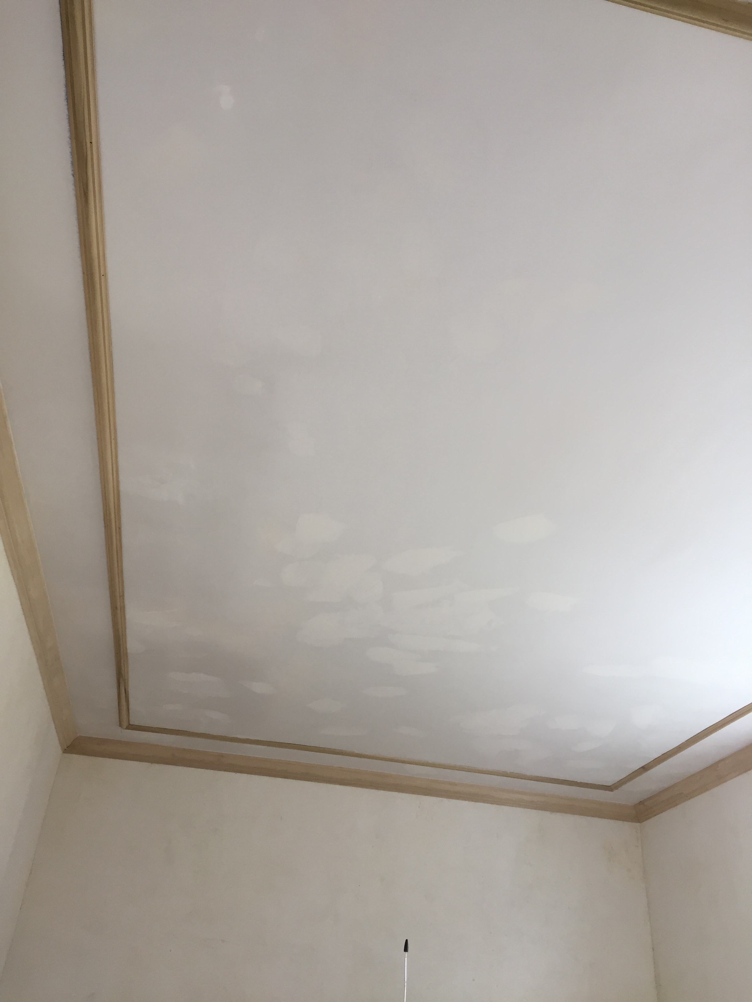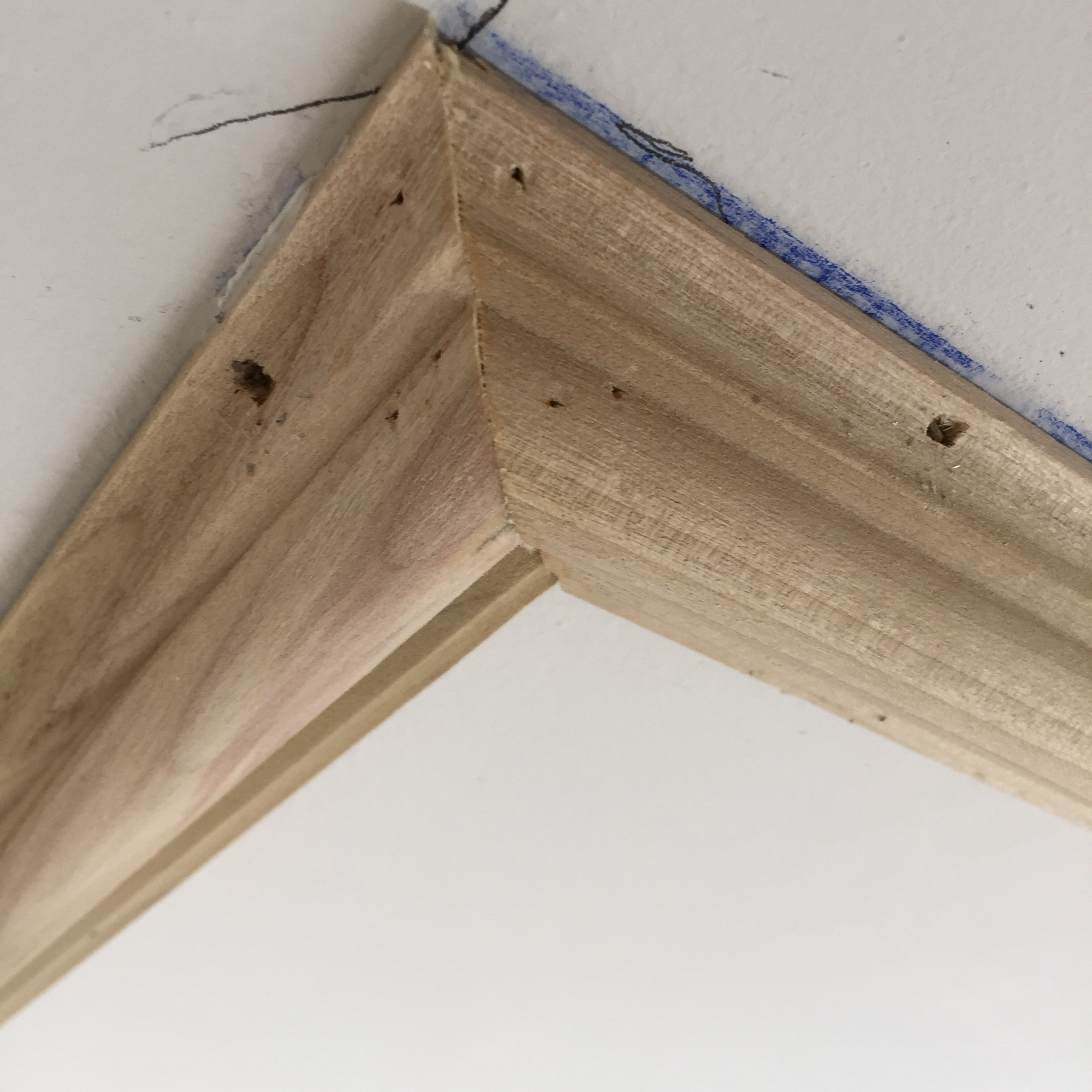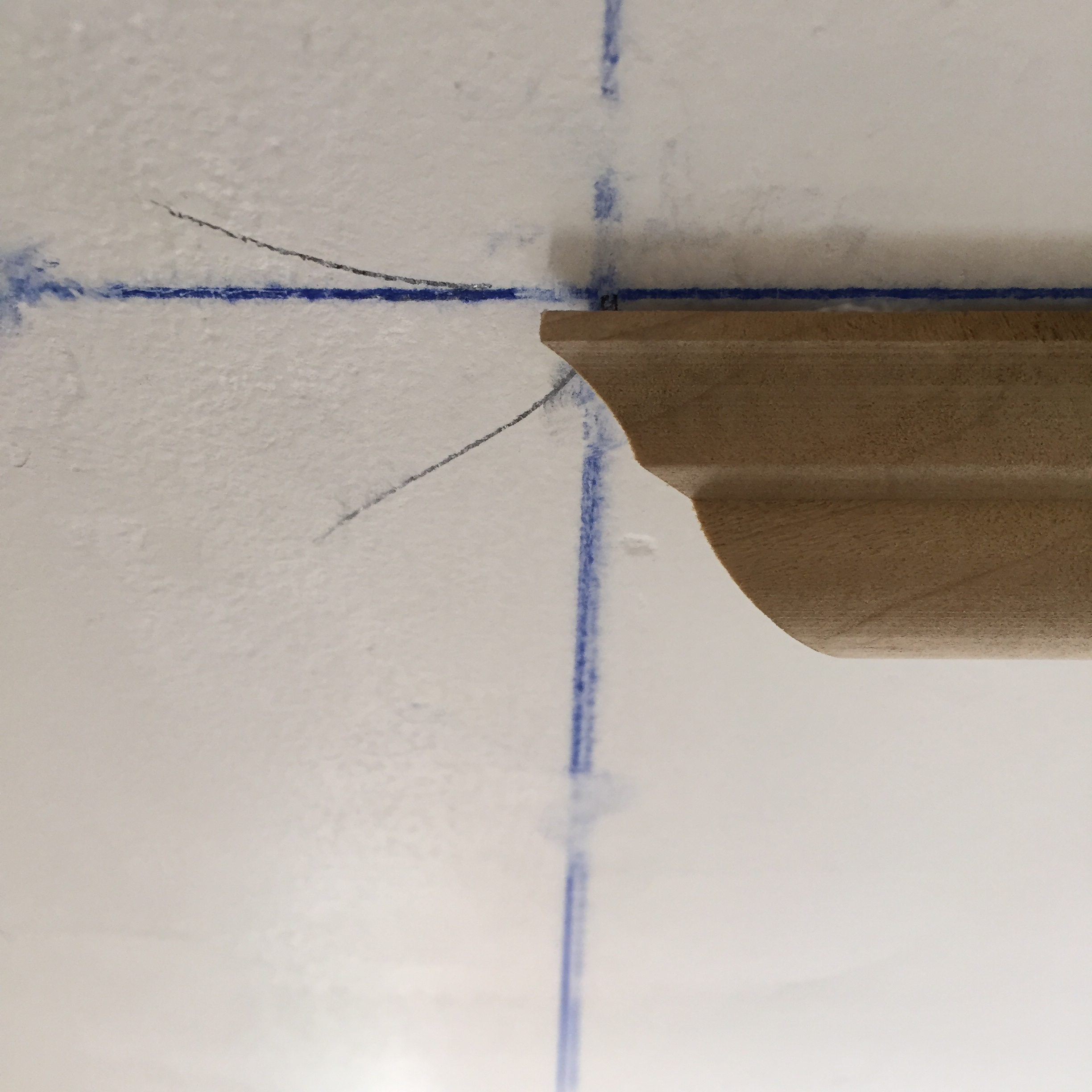 Using a stud finder and a finish nail to penetrate and confirm nailers, we located the strapping in the ceiling and marked their location. Because the strapping is installed perpendicular to the ceiling joists, we were only able to direct nail into solid nailers on two sides of the rectangular molding pattern.