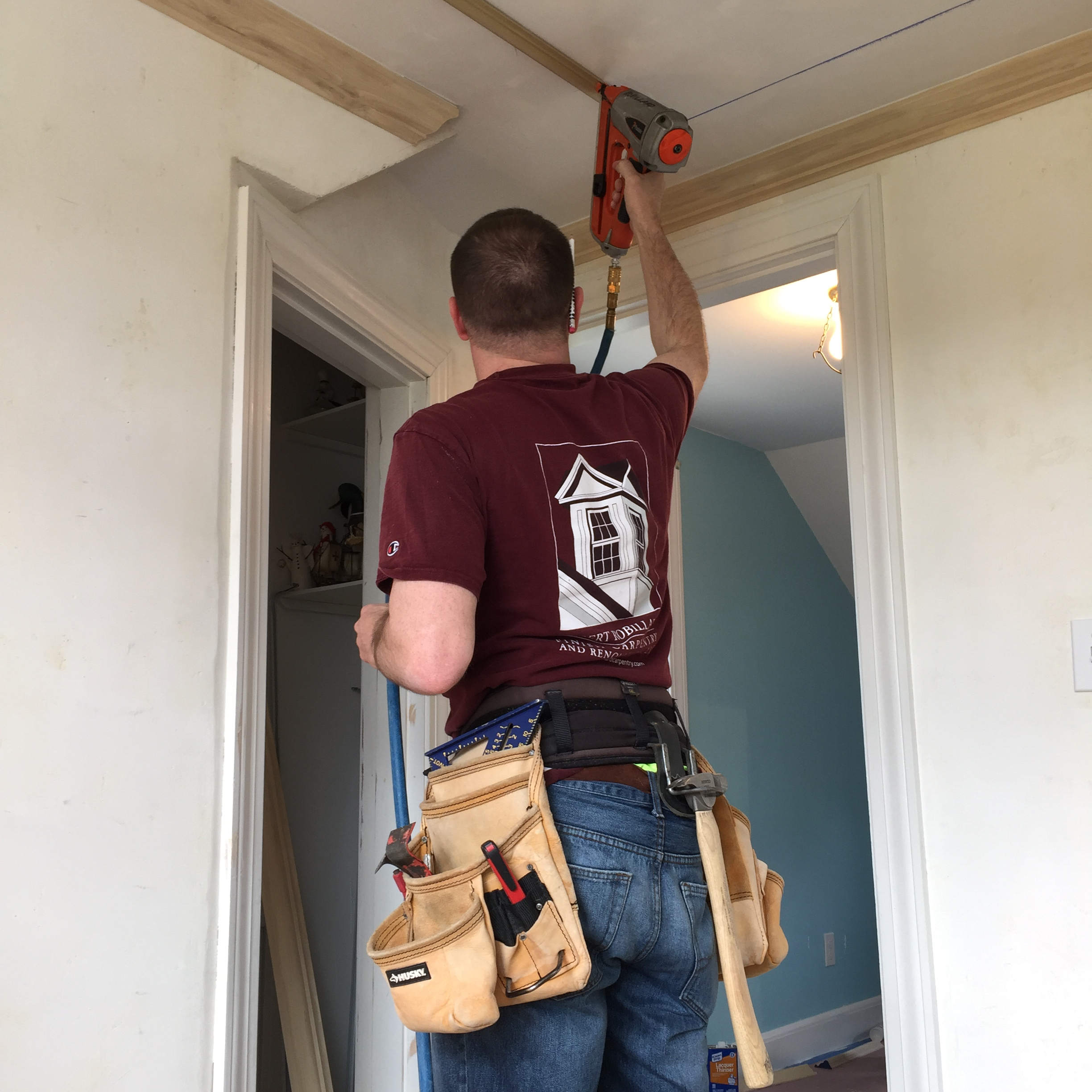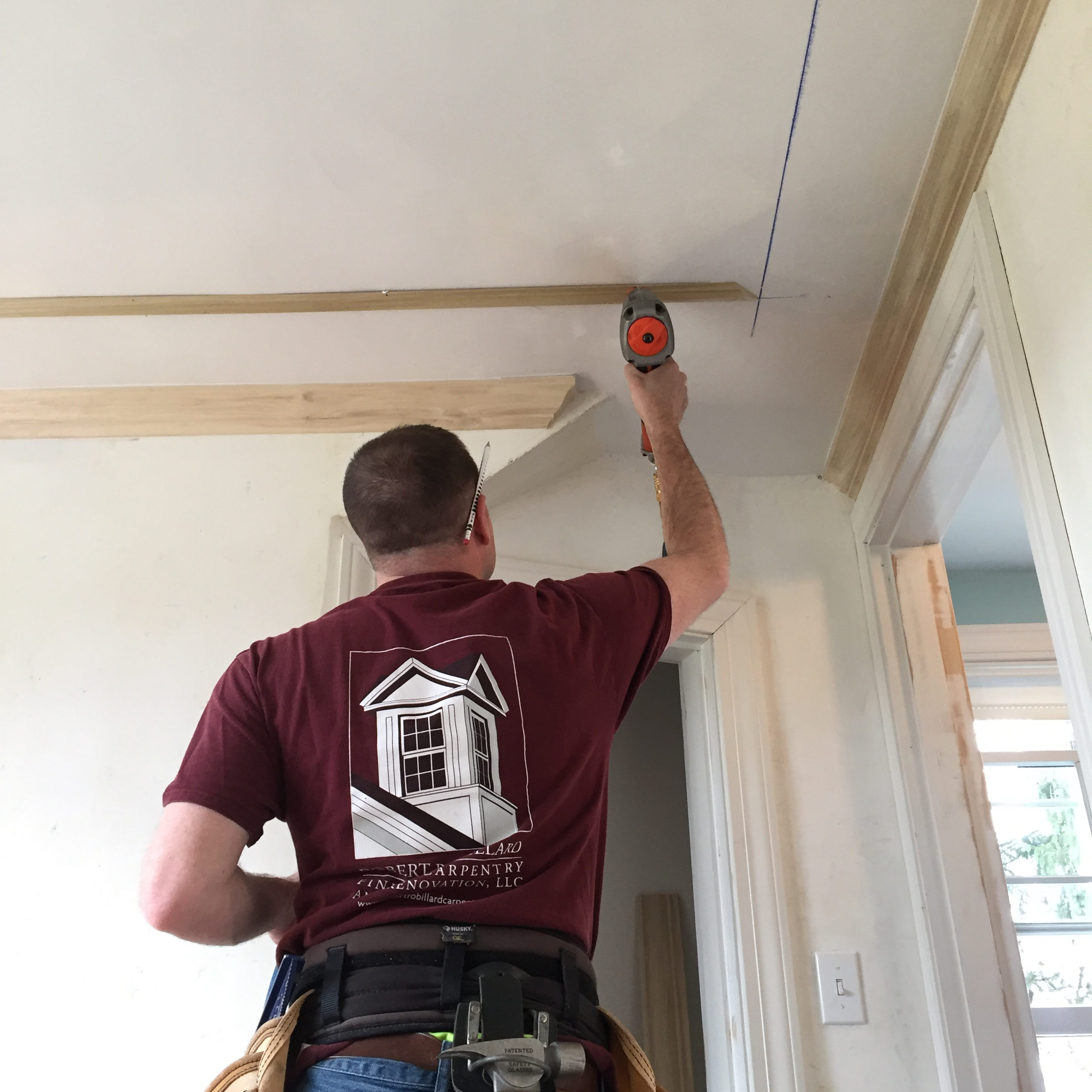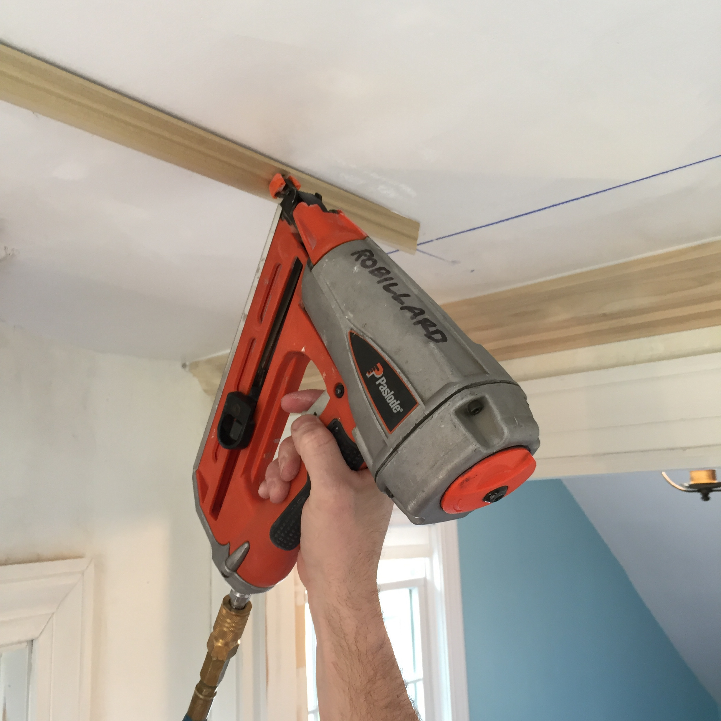 Holding the moldings against up to the ceiling, and along the chalk line we installed two pneumatic opposing finish nails, on each side of the astragal molding, every 12-inches. On the area that has strapping I install the nails directly into the strapping. On the opposite, non-strapped ceiling area, I try to install the nails at opposing angles to better grip the ceiling plaster board.