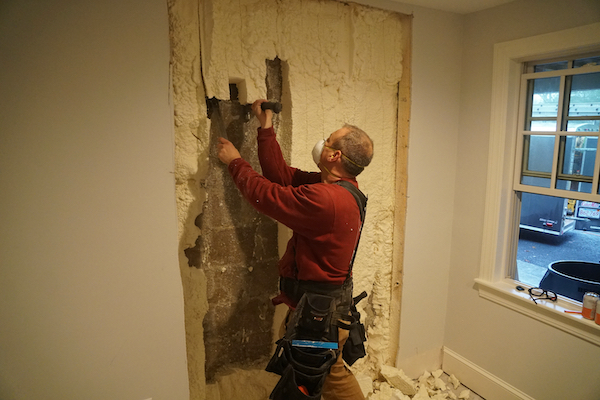 Once you have insulated and sealed off the masonry you can install the partition walls. If using spray foam insulation to seal and insulate you can install your partition walls ahead of time. Ensure that you space the wall away from the masonry 1-2 inches to create a capillary gap between the masonry and wood wall or metal studs.