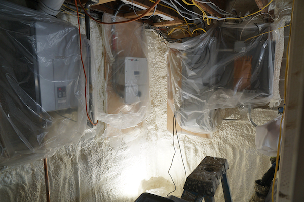 Our spray foam contractor, InsulationDoneRight.com, recommends keeping utility equipment separate from spray foam in remodels where panels and equipment are already mounted to the wall. To do this it is recommended that you frame a room around your utility equipment, and insulate those walls around the room. This effectively creates a cold, or non-conditioned room for the utility equipment. In a new construction build it is recommended you hang a wall of the concrete 3-4 inches to allow for foam board to be slid beyond the wall or frame a small 8-12′ section of wall and have that insulated prior to the installation of the mechanicals.
