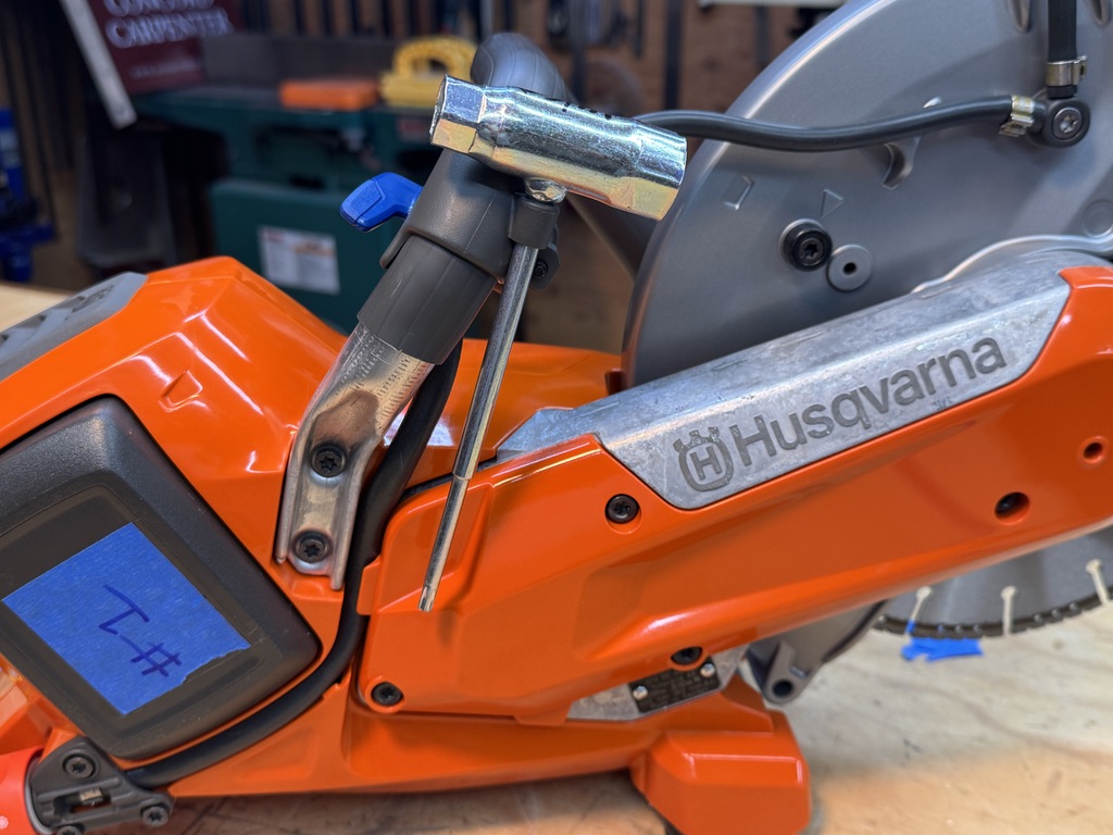 Husqvarna and Makita both store their scrench in a clip mounted to the support handle. The team found this location convenient but more prone to loss during transport or heavy use. Stihl does not offer on-board wrench storage, which was seen as a drawback for convenience.