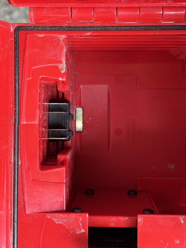Milwaukee and Atlas both have lids covering their batteries. Atlas uses an external plastic latch that the team felt might easily break, while Milwaukee’s design is flush with the housing, offering better protection.