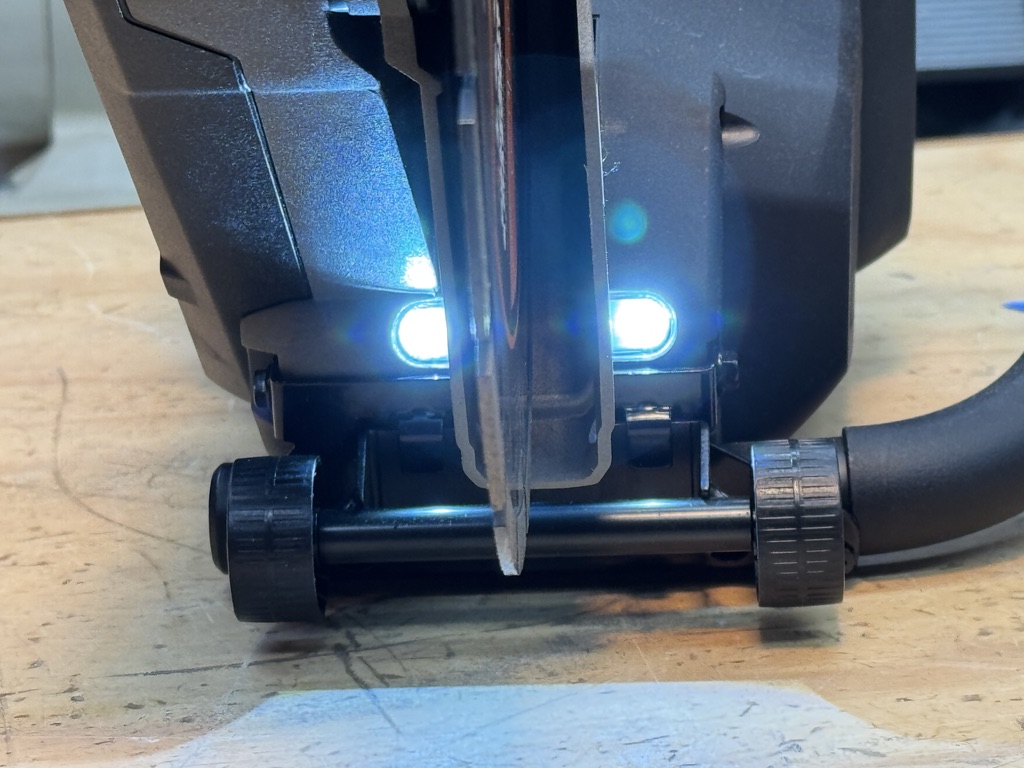 Bosch, Evolution, and Makita include LED work lights. Evolution and Makita have dedicated switches to turn the lights on or off. Evolution stands out with dual high-intensity lights, positioned on either side of the blade.