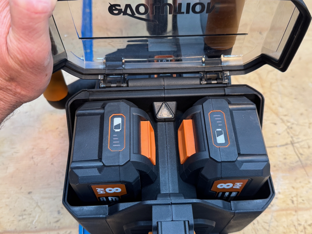 Evolution has two batteries and requires users to place the tool down and hold the spring-loaded lid open. Evolution features a spring-loaded battery lid that automatically closes and latches securely.