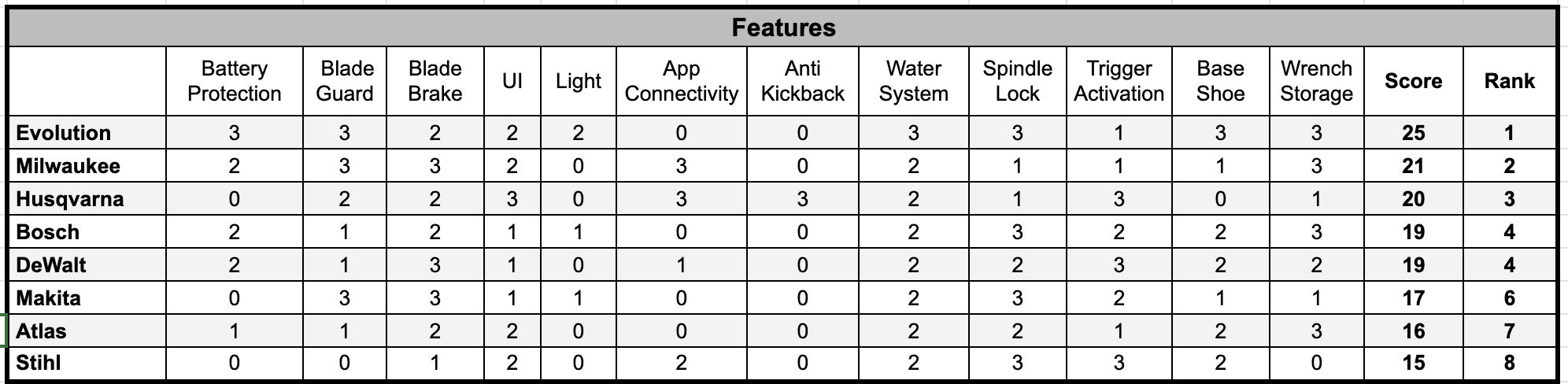 Milwaukee ranked second for its AP connectivity, blade guard, and blade brake, while Husqvarna came in third, noted for its user interface, anti-kickback system, and trigger activation.