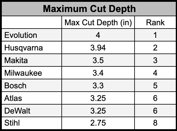 In third place is Makita, offering a 3.5-inch cutting depth. Stihl comes in last with the smallest capacity at 2.75 inches.