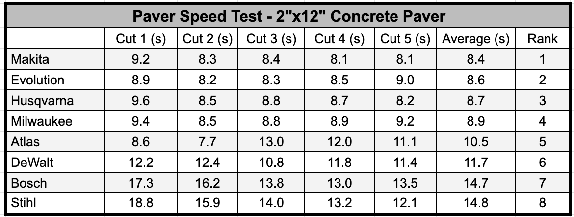 Evolution came in next with 8.6 seconds, followed by Husqvarna with 8.7 seconds and Milwaukee with 8.9 seconds.