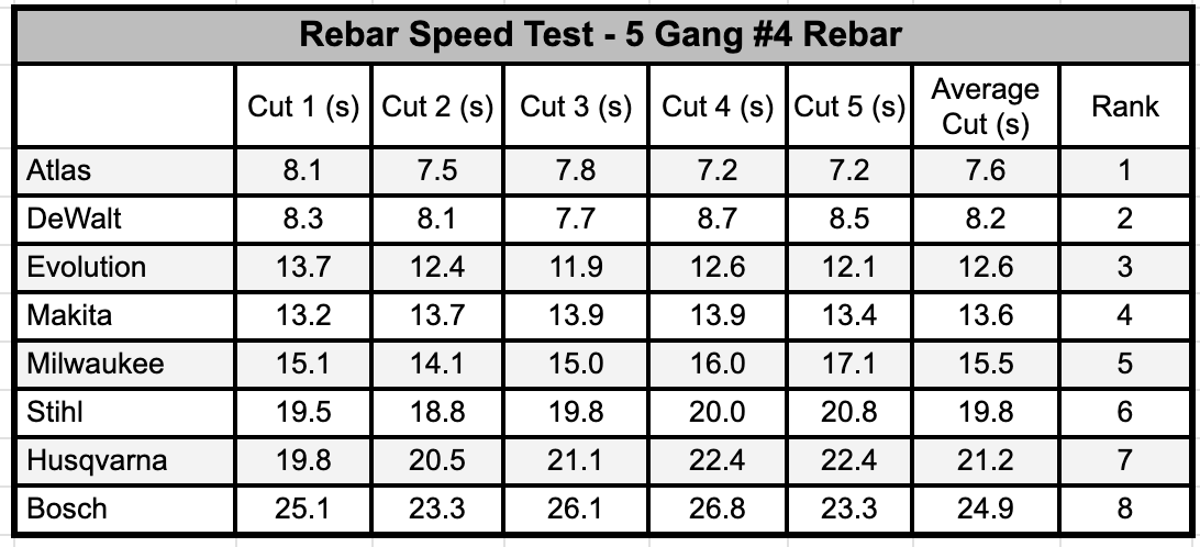 This test was designed to measure and evaluate the average time to cut through a bundle of five #4 rebar, a common cutting operation seen on jobsites.