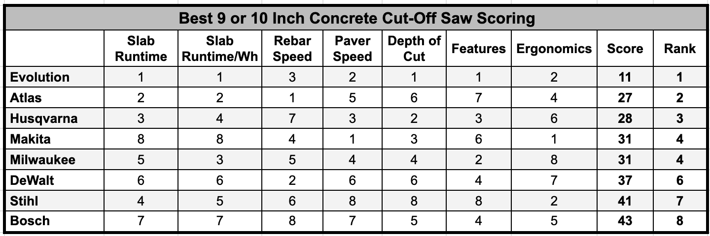 The next closest saw in this test was the Atlas with 27-points. It was the fastest in our rebar cutting test and second place in both slab cutting categories. Third was the Husqvarna with 28-points.