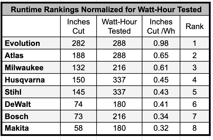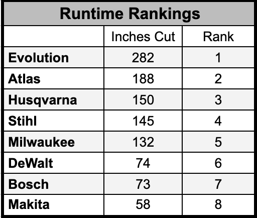 The winner of the normalized runtime test was Evolution with an Inches Cut per Watt-Hour of 0.98. We recognize that these values are unique to this test but eh important take away is the relative performance from saw to saw. This is especially relevant when the next closest saw was the Atlas with an Inches Cut/Wh of 0.65. Third place was Milwaukee at .61.