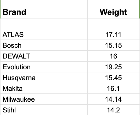 We weighed each tool with the battery tested. Milwaukee tipped the scales at 14.14 lbs, Stihl was 14.20 lbs a the next lighter was Bosch at 15.5 lbs. The heaviest saw was the Evolution at 19.25 lbs.