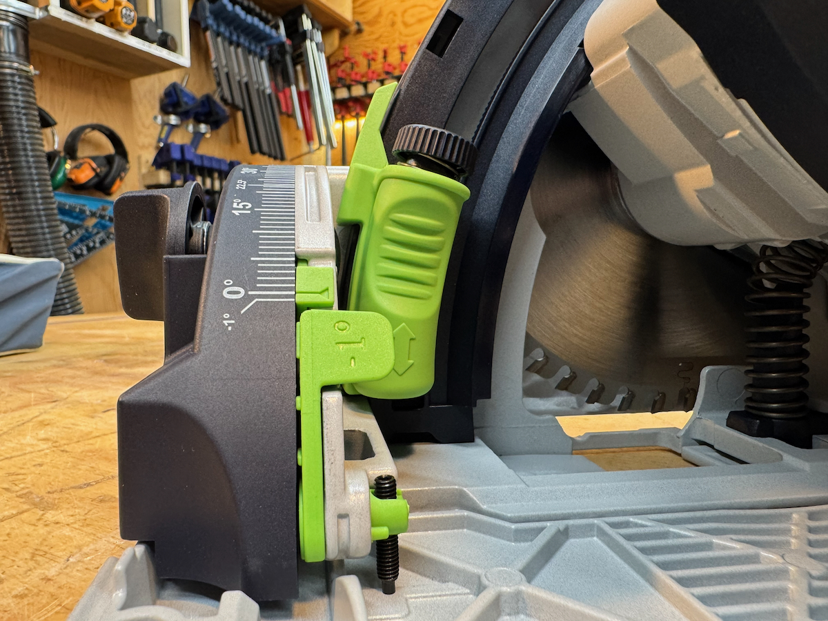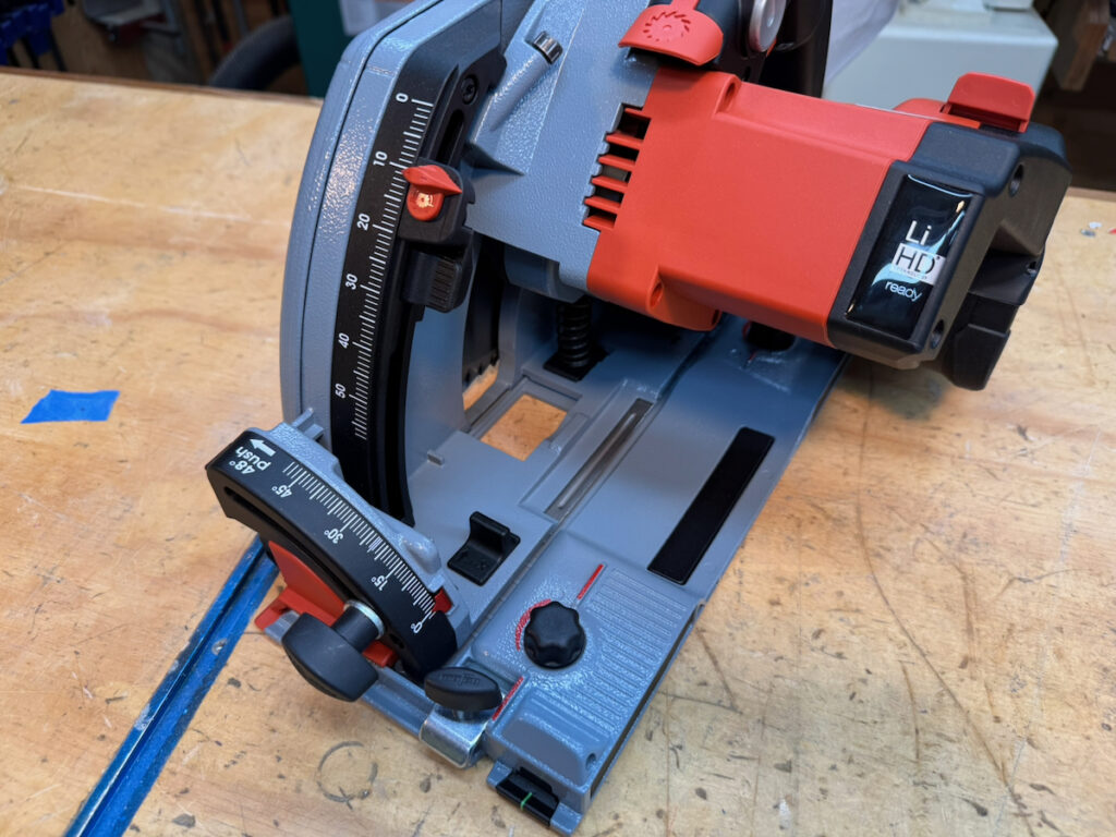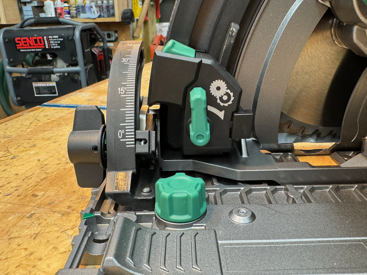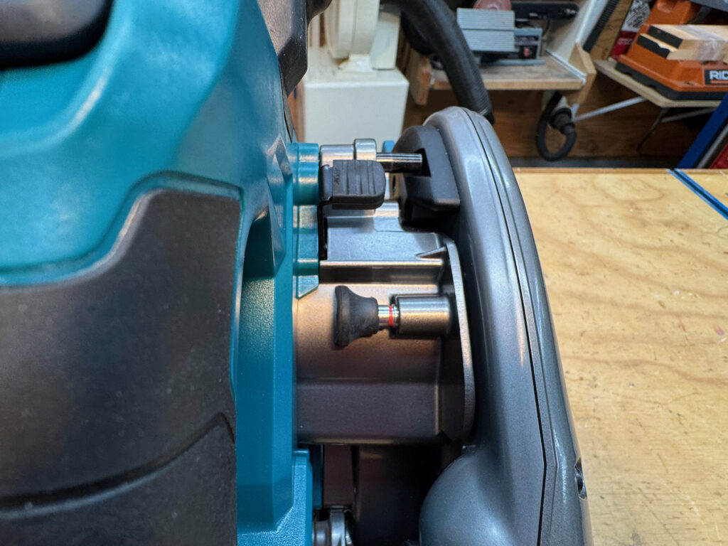 On Festool, Hilti, Mafell, Makita LXT, and the Metabo HPT, saws, battery placement—particularly with larger battery packs—can partially obstruct access to the rear adjustment controls. They all use large, easy-to-turn knobs with a stiff, confidence-inspiring feel.