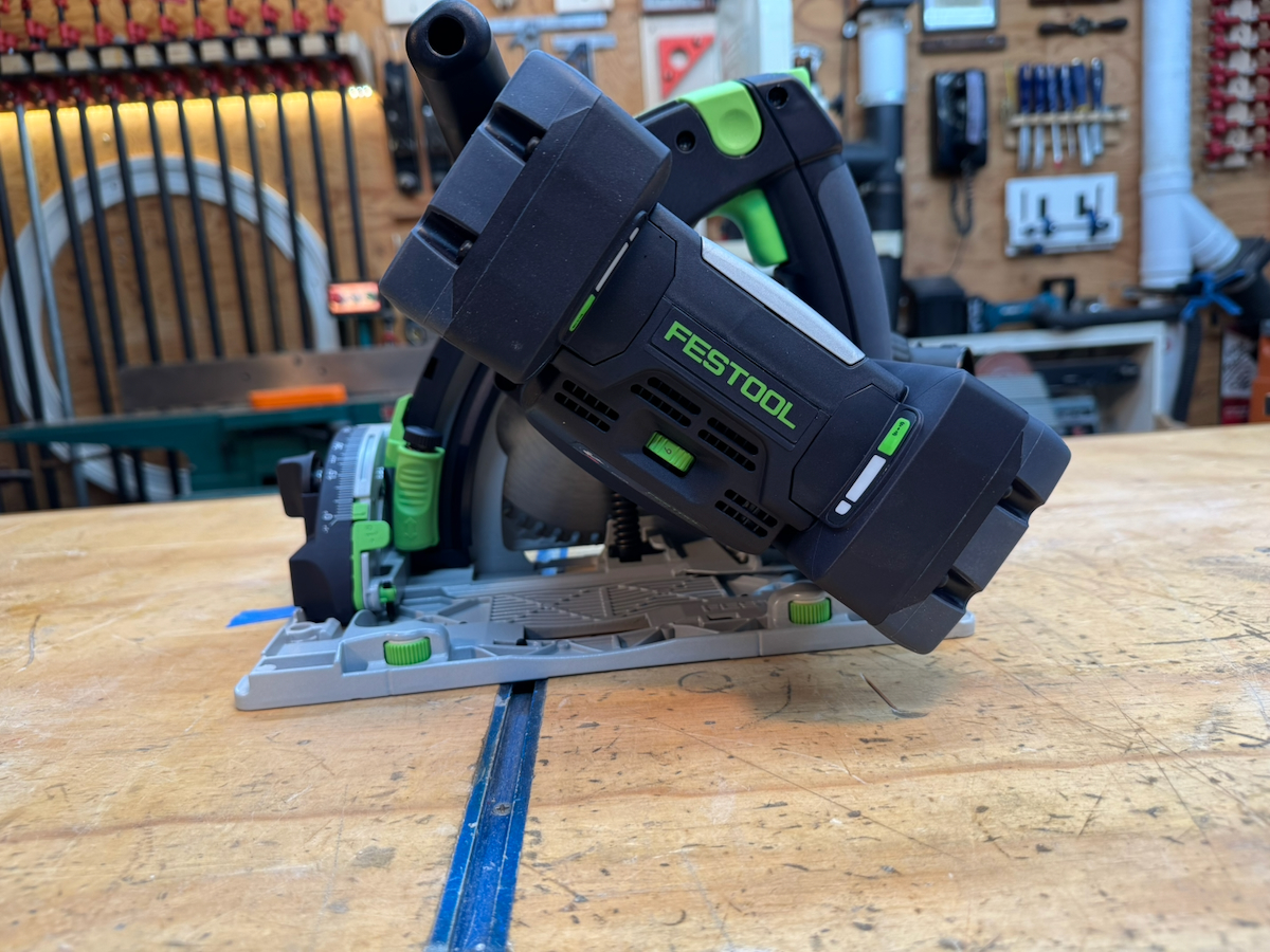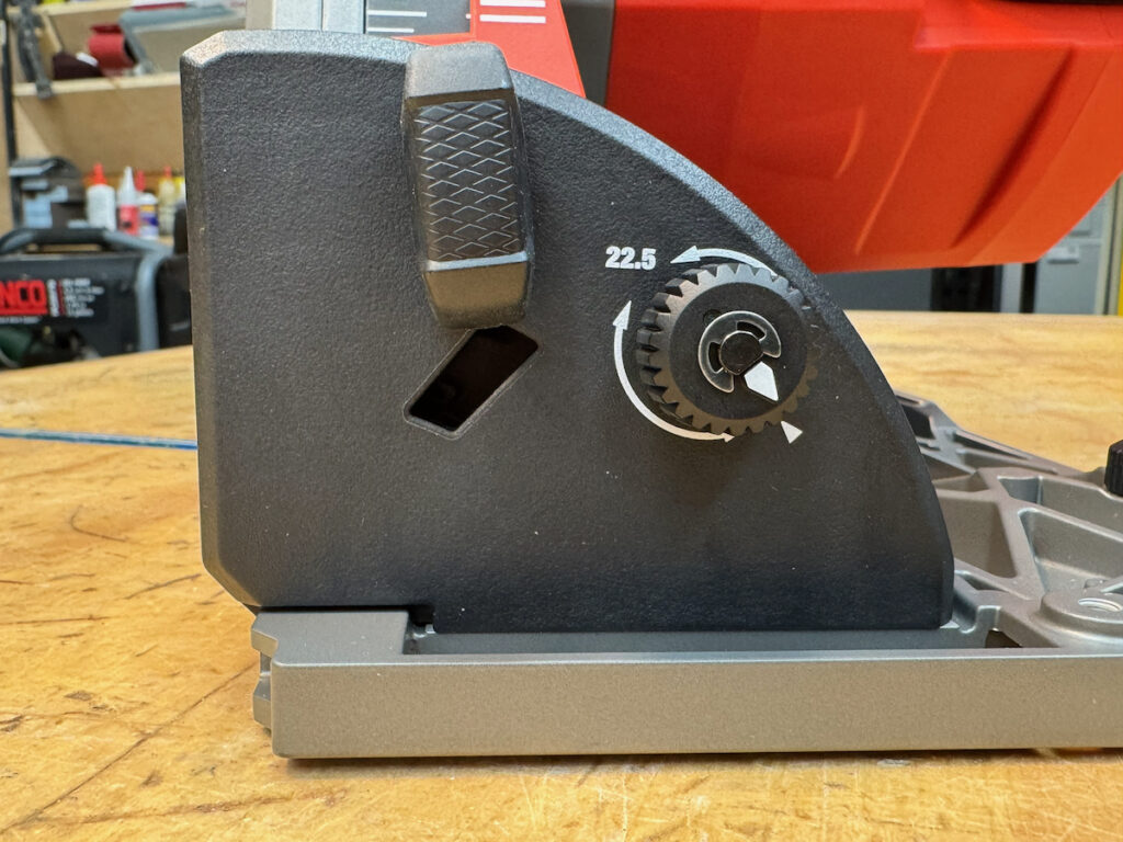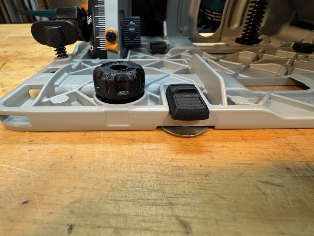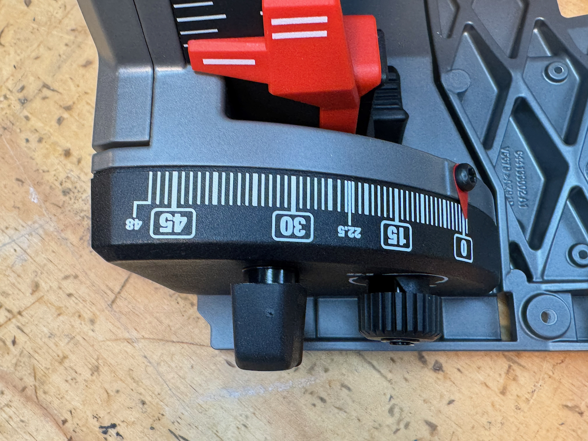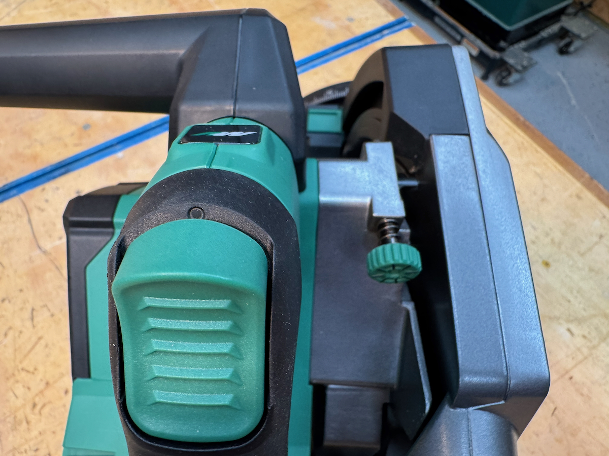 On Festool, Hilti, Mafell, Makita LXT, and the Metabo HPT, saws, battery placement—particularly with larger battery packs—can partially obstruct access to the rear adjustment controls. They all use large, easy-to-turn knobs with a stiff, confidence-inspiring feel.