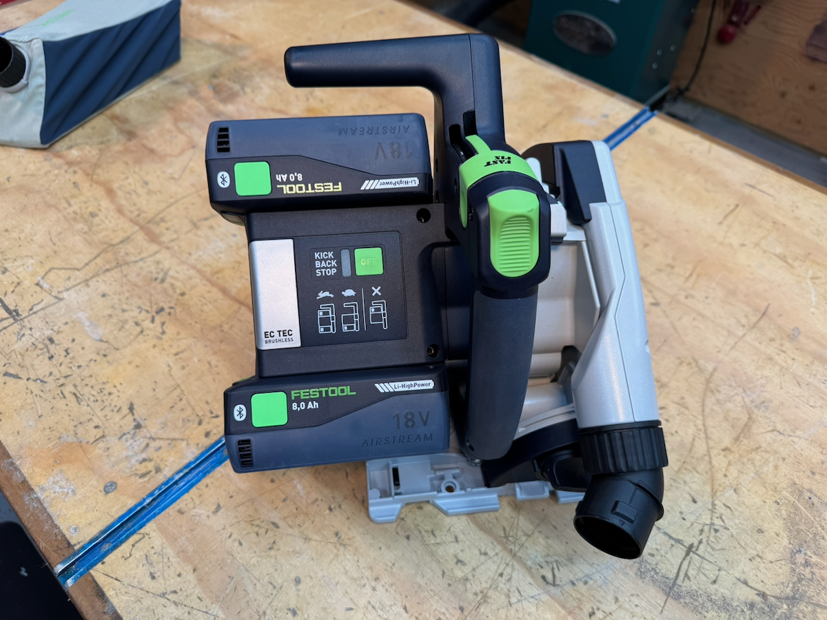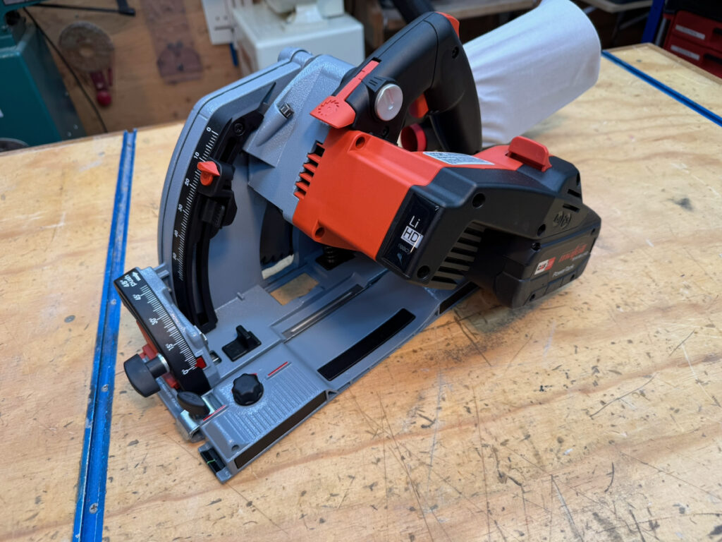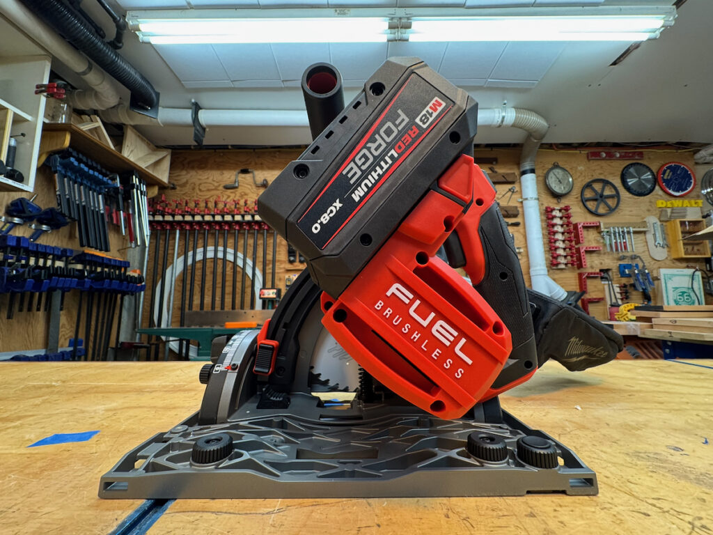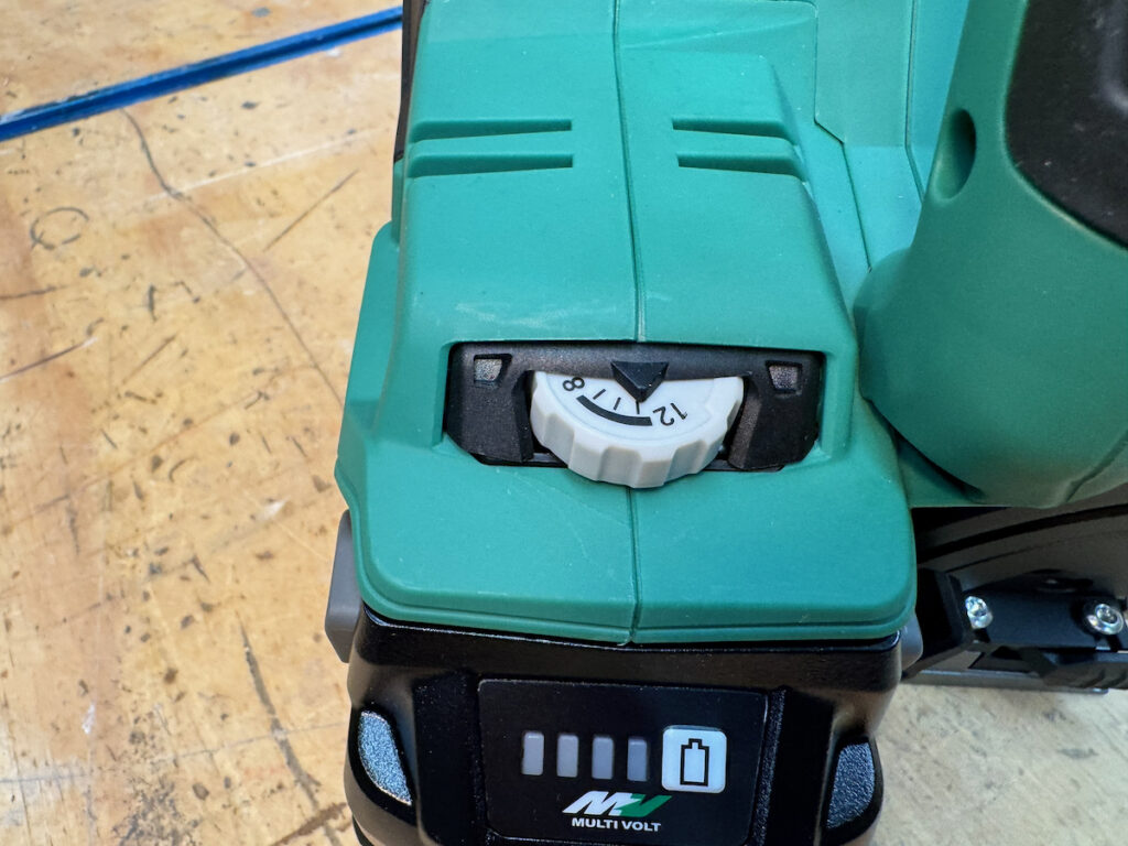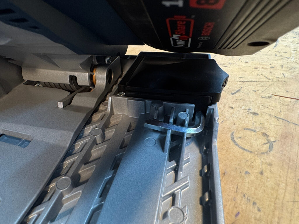 On Festool, Hilti, Mafell, Makita LXT, and the Metabo HPT, saws, battery placement—particularly with larger battery packs—can partially obstruct access to the rear adjustment controls. They all use large, easy-to-turn knobs with a stiff, confidence-inspiring feel.