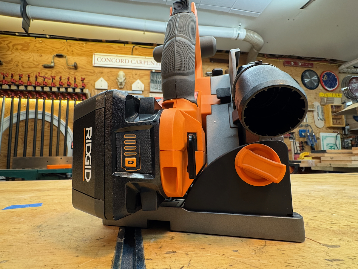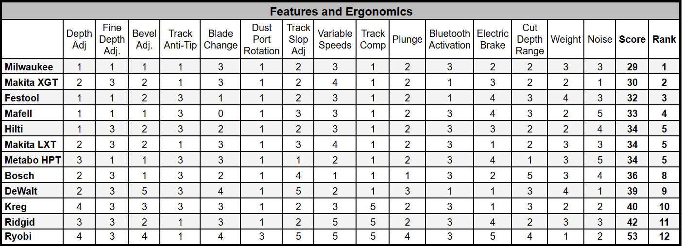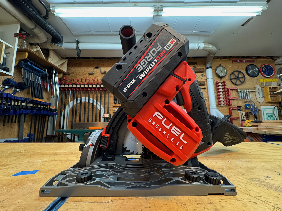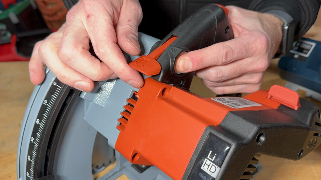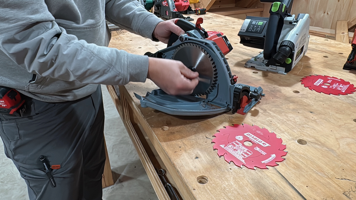 The Mafell was the clear standout in this category. Its single bevel adjustment knob, combined with a push-button and lever blade-change system that also locks the arbor, makes setup intuitive and adjustments quick and easy. It also features a dedicated surface on the front corner of the base plate, opposite the blade, where the user can apply thumb pressure to help prevent the saw from tipping during bevel cuts—a nice ergonomic touch.