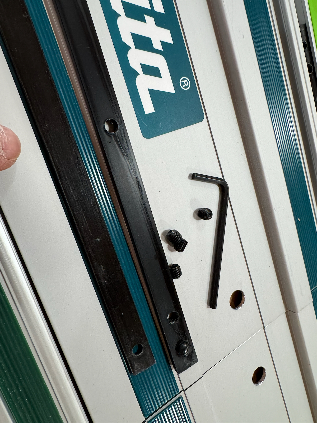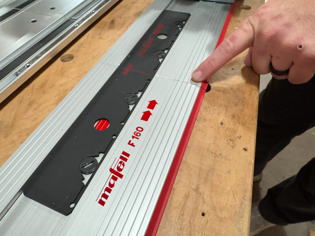 Makita has a 4-piece joining rod system – one for the top and one for the bottom of the guide rail. Installing these rods requires precise alignment and can result in user frustration. Similar to the Festool, once the rods are in place, we recommend you store them on the guide rail to avoid future frustration. We also noticed some “lippage” on the cut side of the rail.