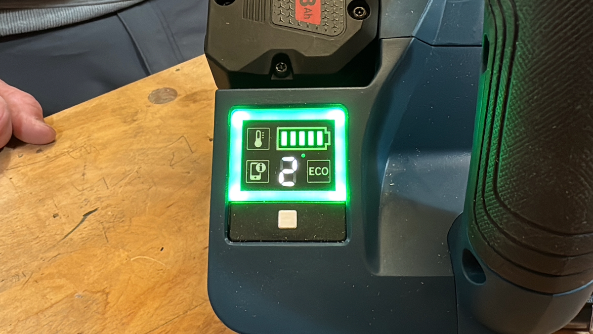 The Bosch interface is an illuminated user interface that provides clear, at-a-glance control and feedback. It offers a push button to select six variable speed settings, and an ECO mode to extend battery runtime by up to 30 percent.
