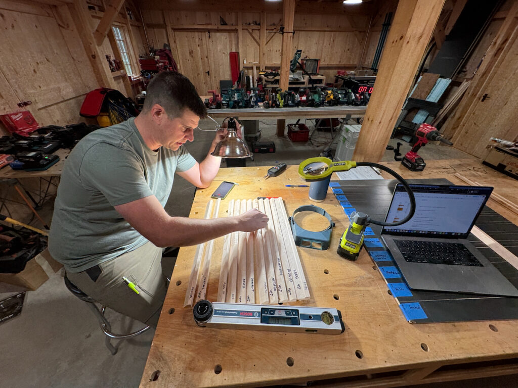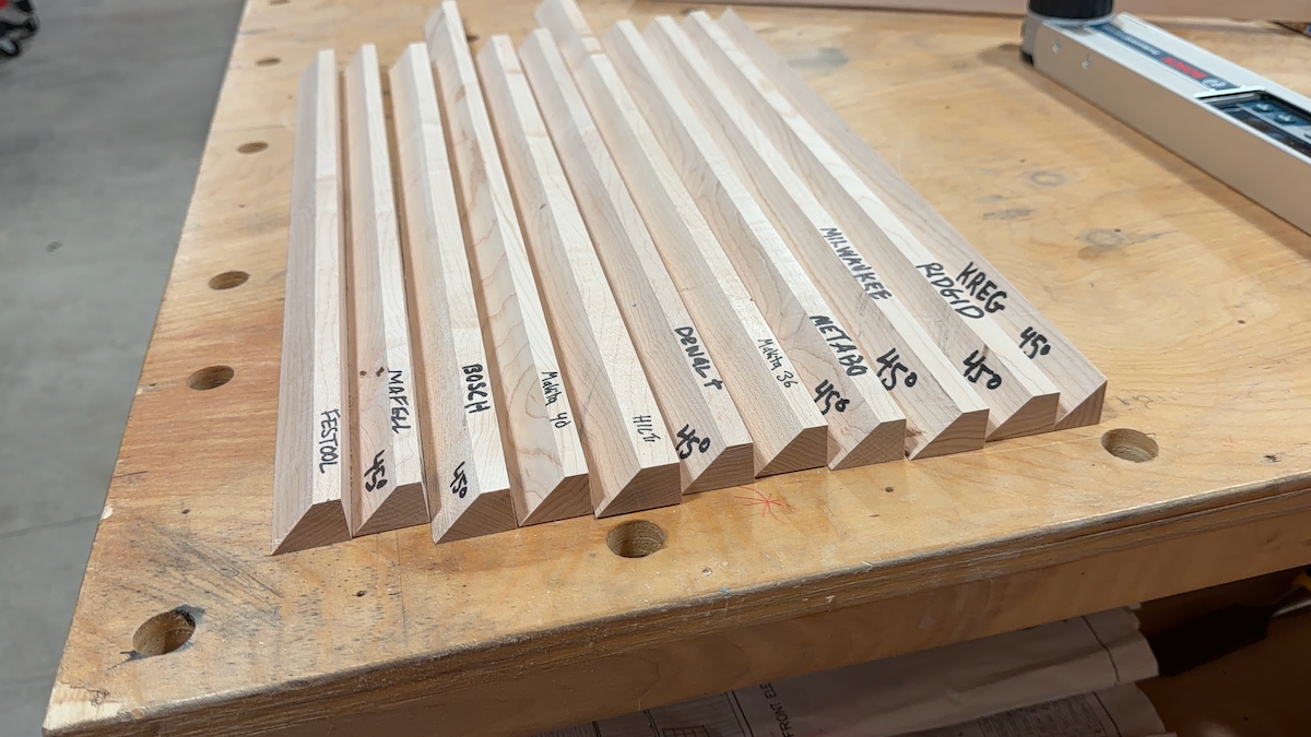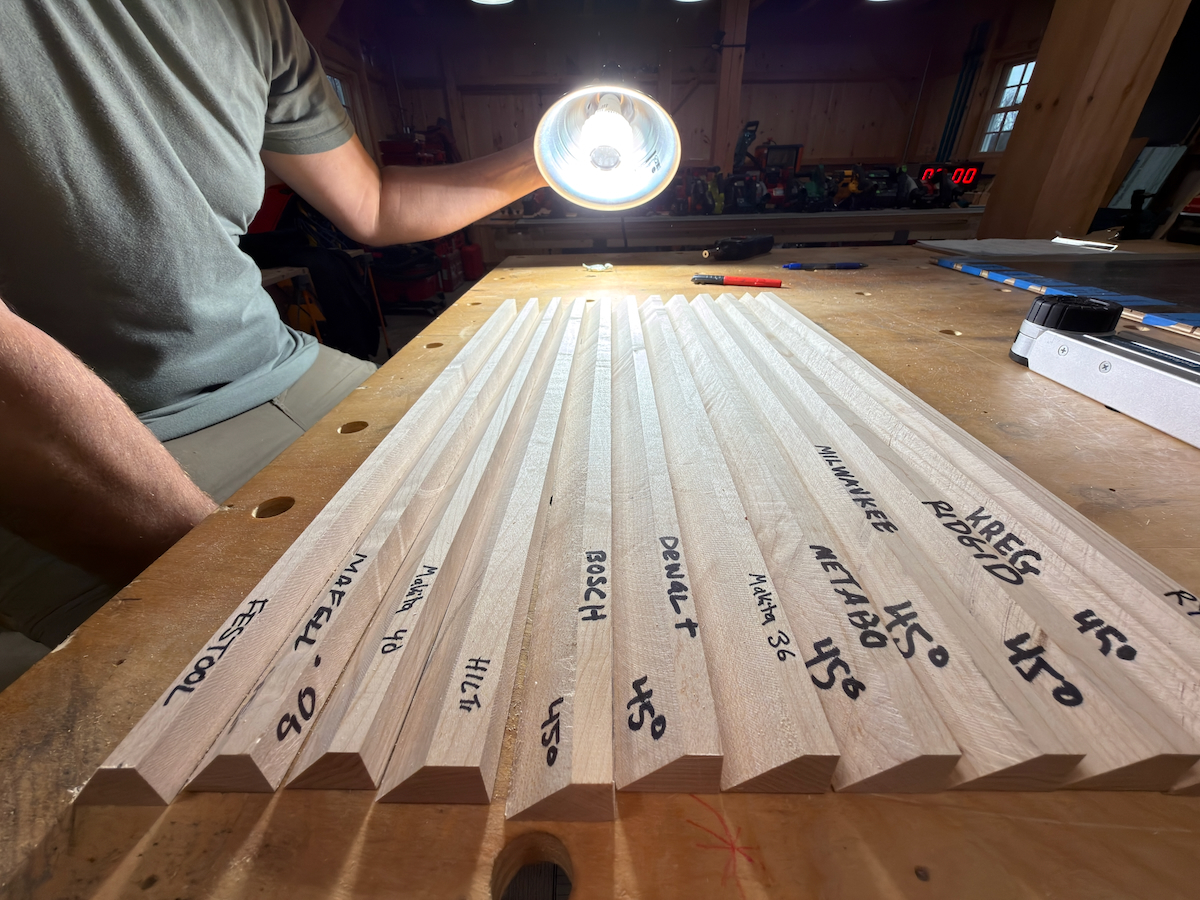 Each saw cut a 90 and a 45-degree rip in the Maple, producing a 90 and 45 side not influenced by factory milling or competitors’ cuts. The angles were then measured using a digital angle scale and scored.