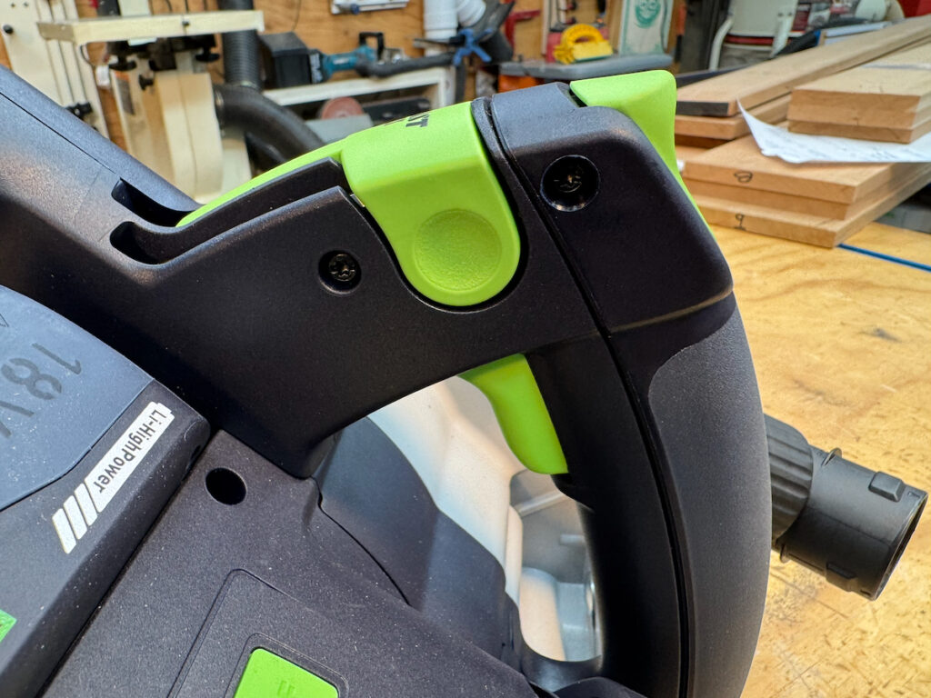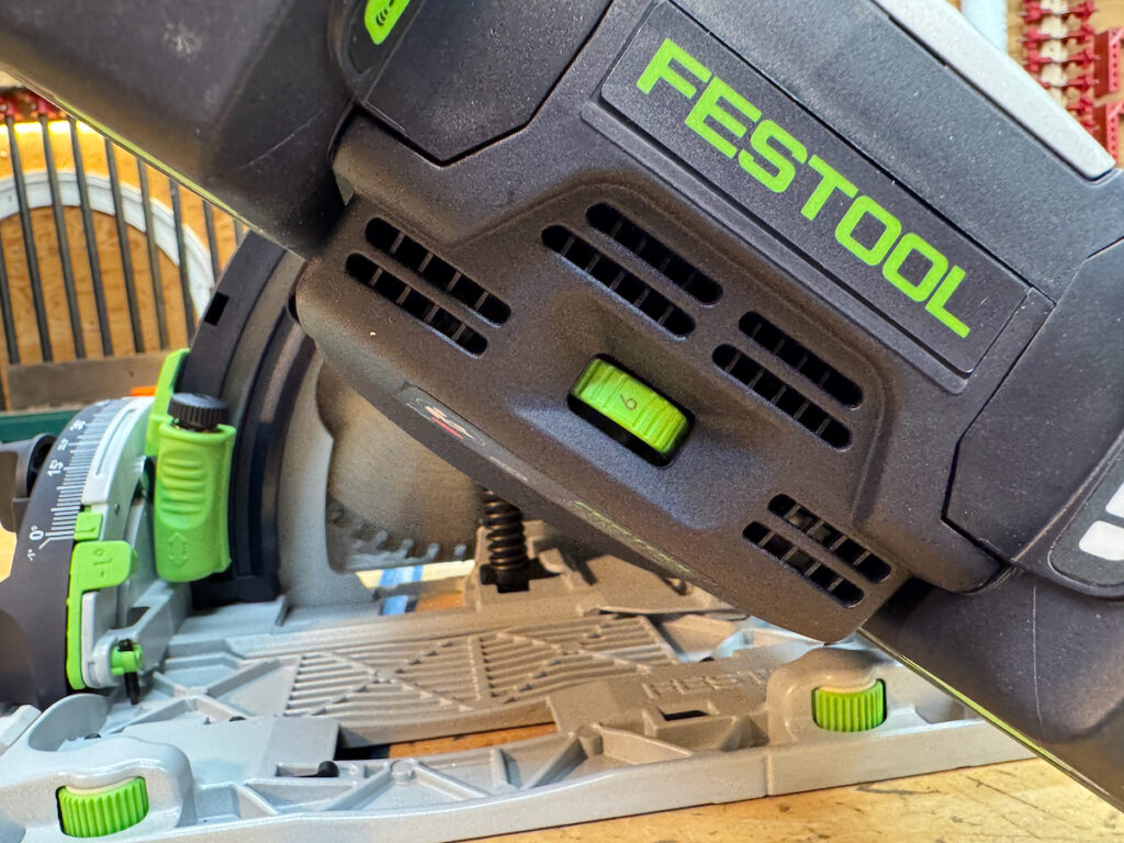 Festool’s buttons and interfaces are almost all in a high-contrast bright green, allowing you to laser focus on the adjustment knobs. The Festool adjustments have a good feel to them and there’s no slop in knobs, buttons, and levers. With little time with this saw it becomes exceedingly easy to use and adjust, and only requires an onboard Allen key for blade changing.