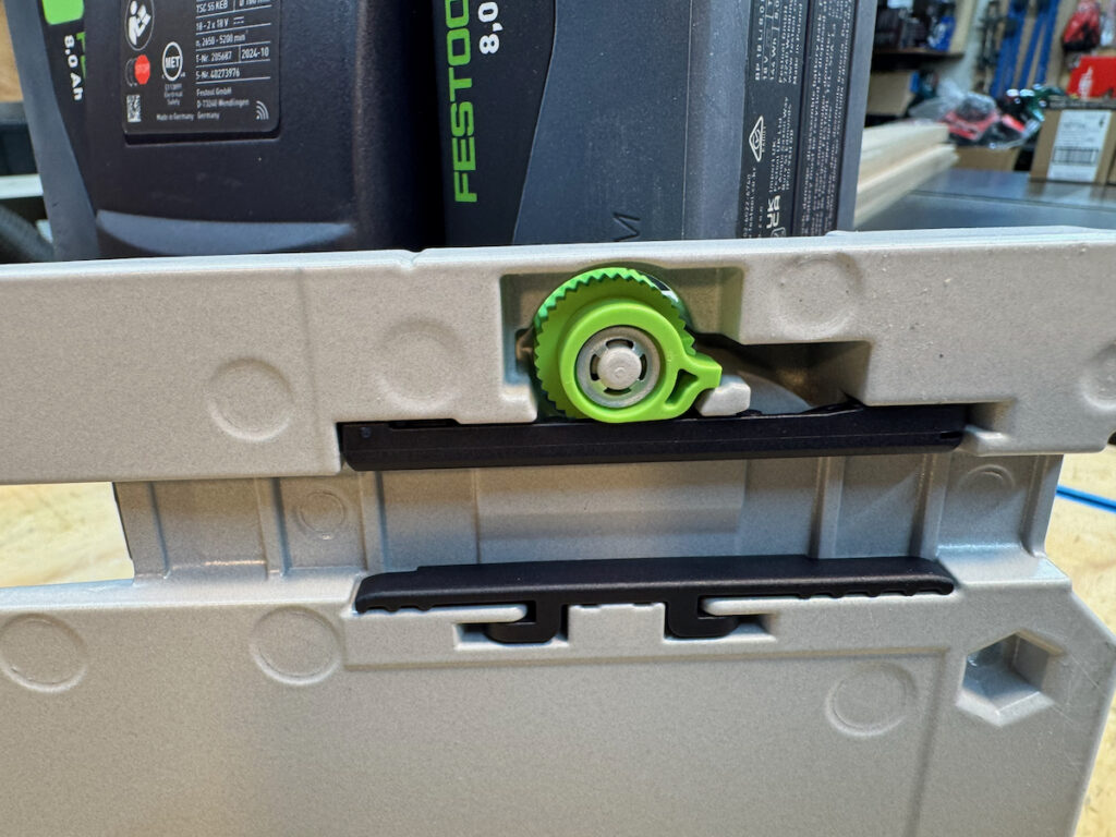 Festool relies on cam-style knobs that push against a replaceable plastic bar; while slightly harder to reach, they hold adjustments securely. Mafell features a dial with detents that provides precise and repeatable settings.