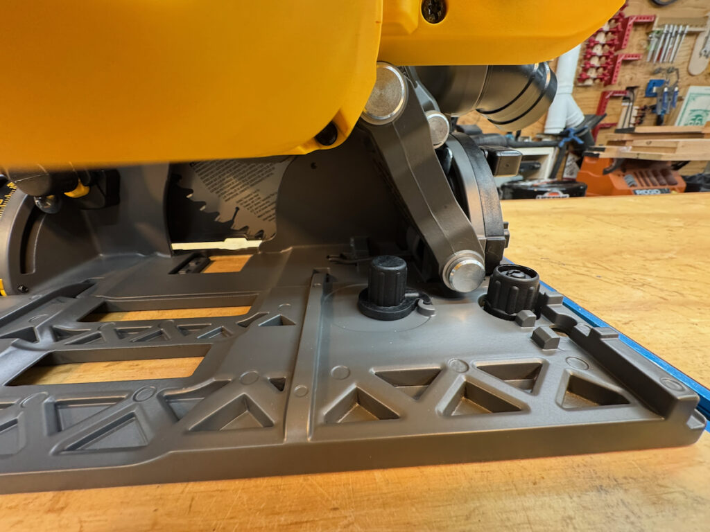 The Metabo HPT saw WOW’d the team with its “one-and-done,” single adjustment knob that engages a cam mechanism and coupling rod that adjusts the saw’s base plate to remove play and ensure a snug fit on the guide rail. Bosch’s adjustment mechanism, however, is too easy to move and can be inadvertently knocked out of position or “over-shoot” your desired setting.