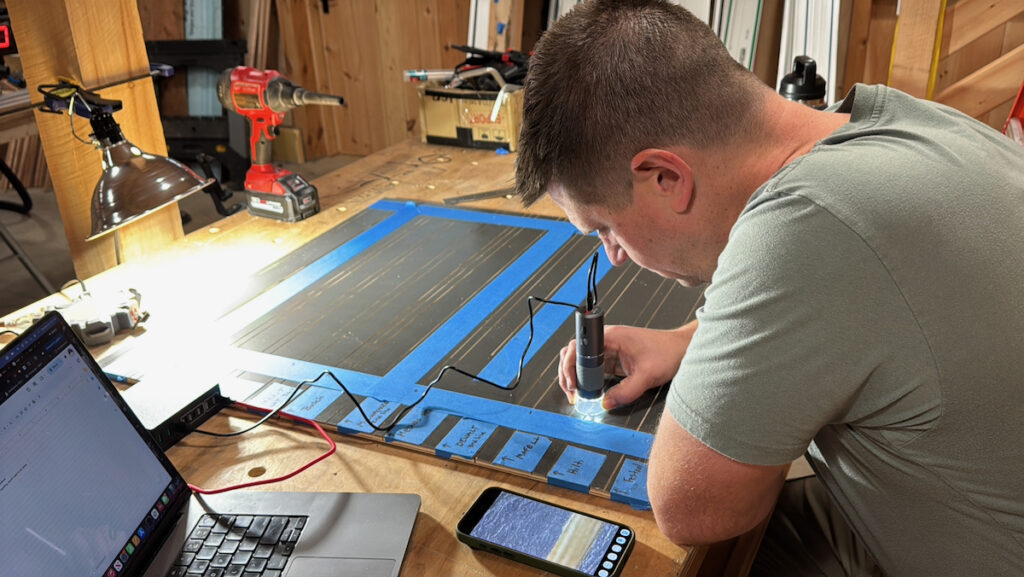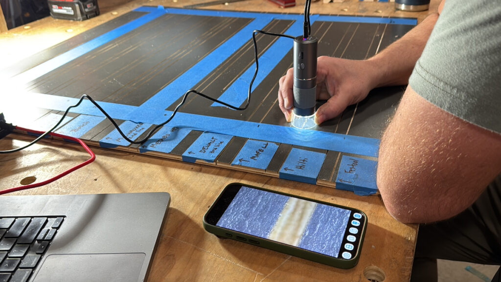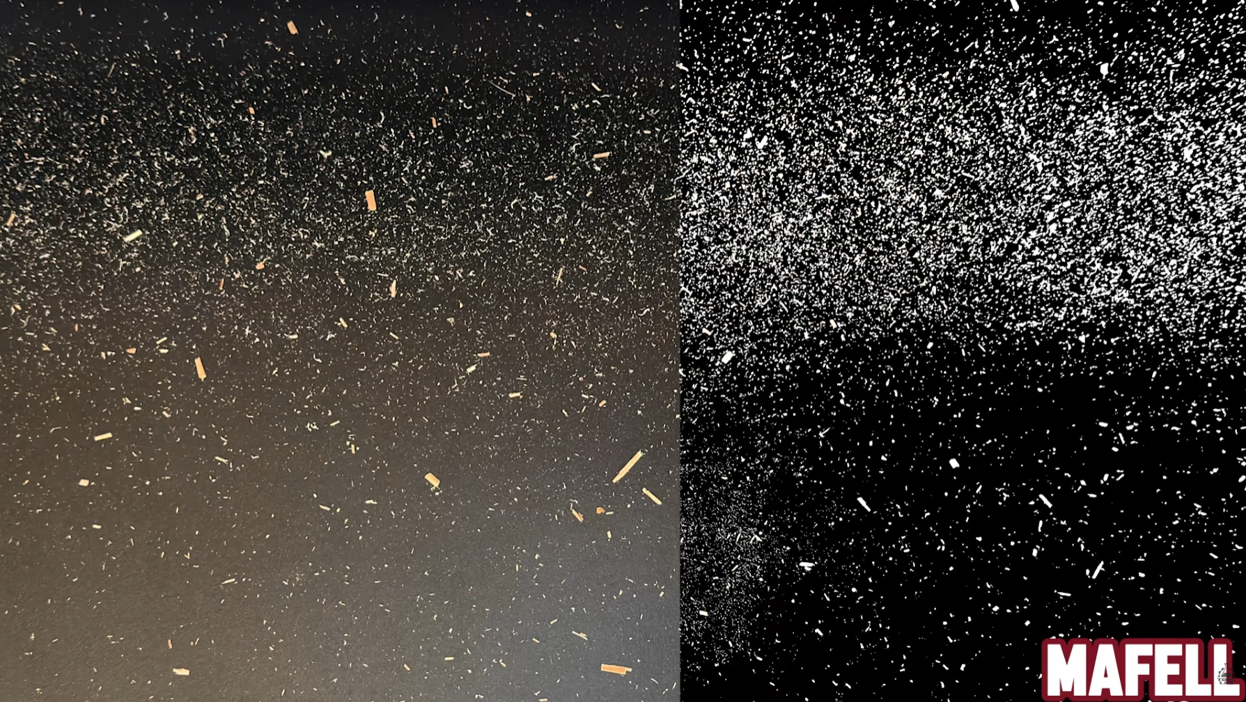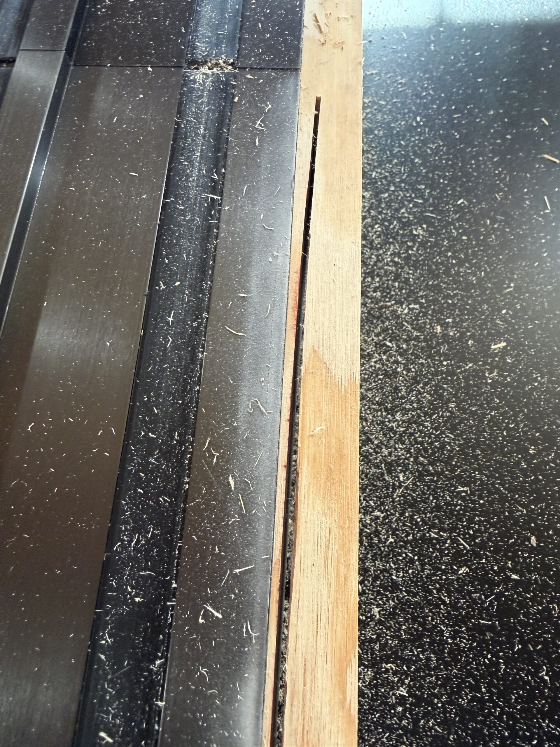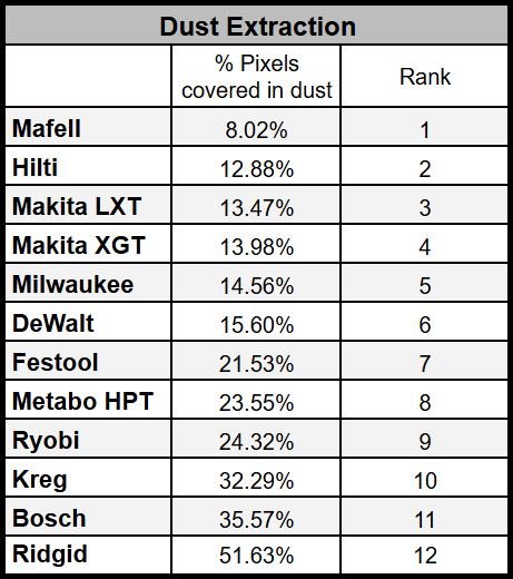 To evaluate the dust-collection performance of each track saw, we placed a blackboard beneath every cut to capture any debris that was not collected. After each cut, the board was photographed, and the image was analyzed to quantify the amount of dust left behind by the dust-extraction system.