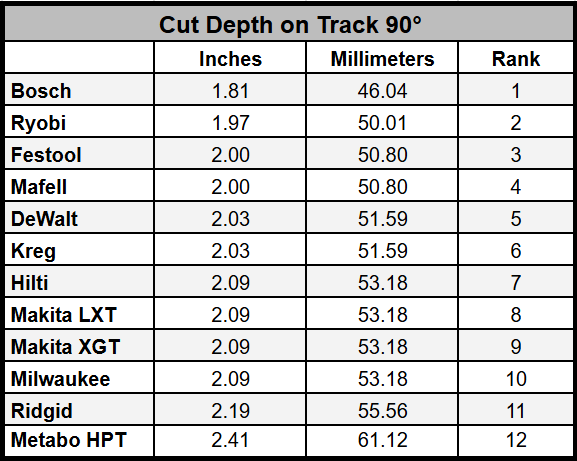 Right behind them is Milwaukee, with a combined error of 0.3 degrees. While not quite matching the near-perfect results of Festool and Mafell, Milwaukee still delivered impressively tight tolerances, with only 0.1 degrees of error at 90 degrees and 0.2 degrees at 45 degrees. That performance puts it well ahead of the majority of the field and makes it a standout option for job site users who need high precision without stepping into the highest price tier.