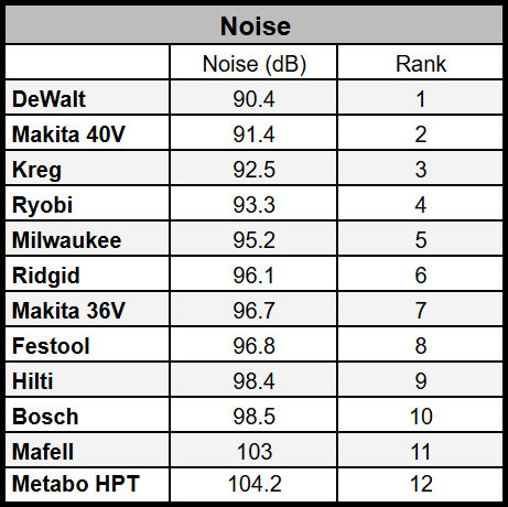 DeWalt takes the top spot with a noise level of 90.4 dB, making it the quietest saw tested. This gives it a noticeable advantage for indoor work or job sites where noise matters.