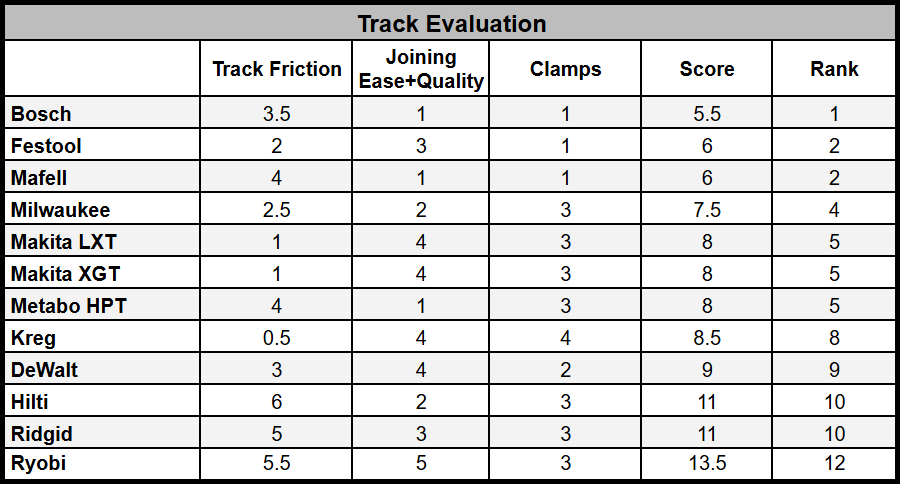 Track connection and alignment performance varies widely across brands, with Bosch, Mafell, and Metabo HPT scoring the highest. These saws use a single-piece connector that aligns tracks exceptionally well, can be secured with a slotted screwdriver or coin, and allows unobstructed clamp travel along the underside of the track.