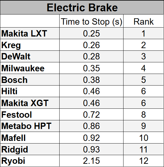 We timed the electric brakes on the saws. All of the saws were under one second, with the exception of the Ryobi, which was 2.15 sec.