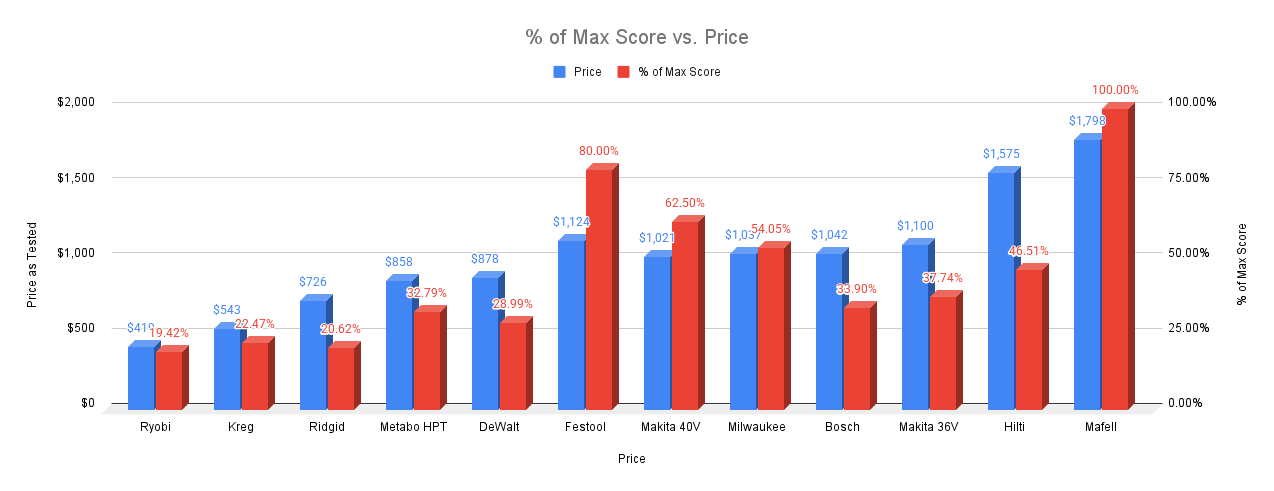 The Festool took 2nd place overall and comes in for $1,124.00, as shown by the red bar almost reaching the top. It’s a great performer, but it’s also one of the more expensive options.