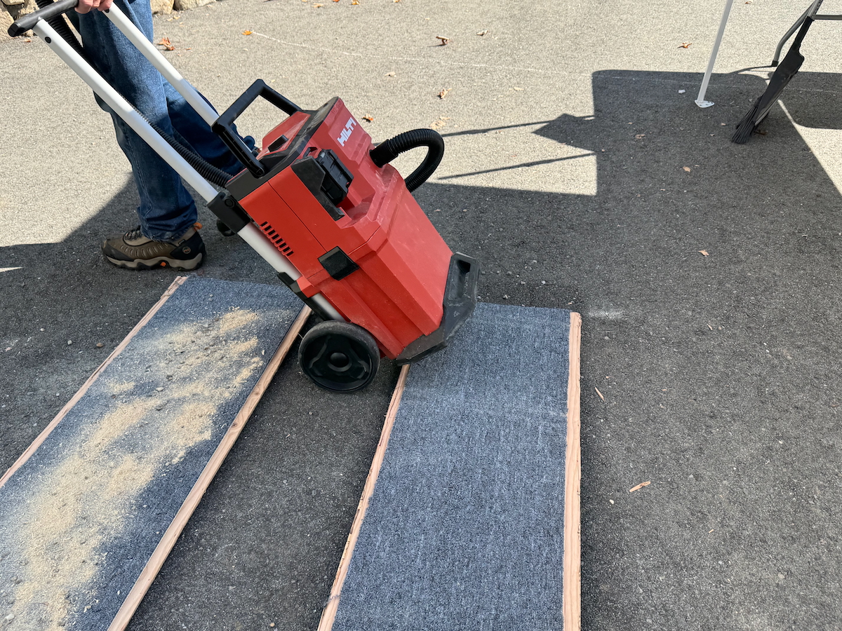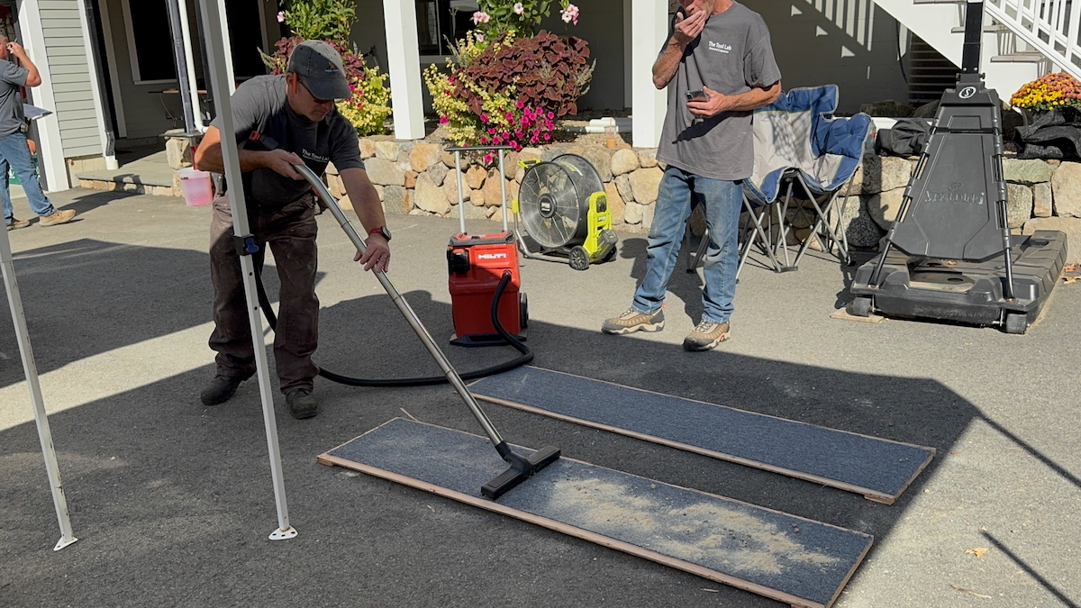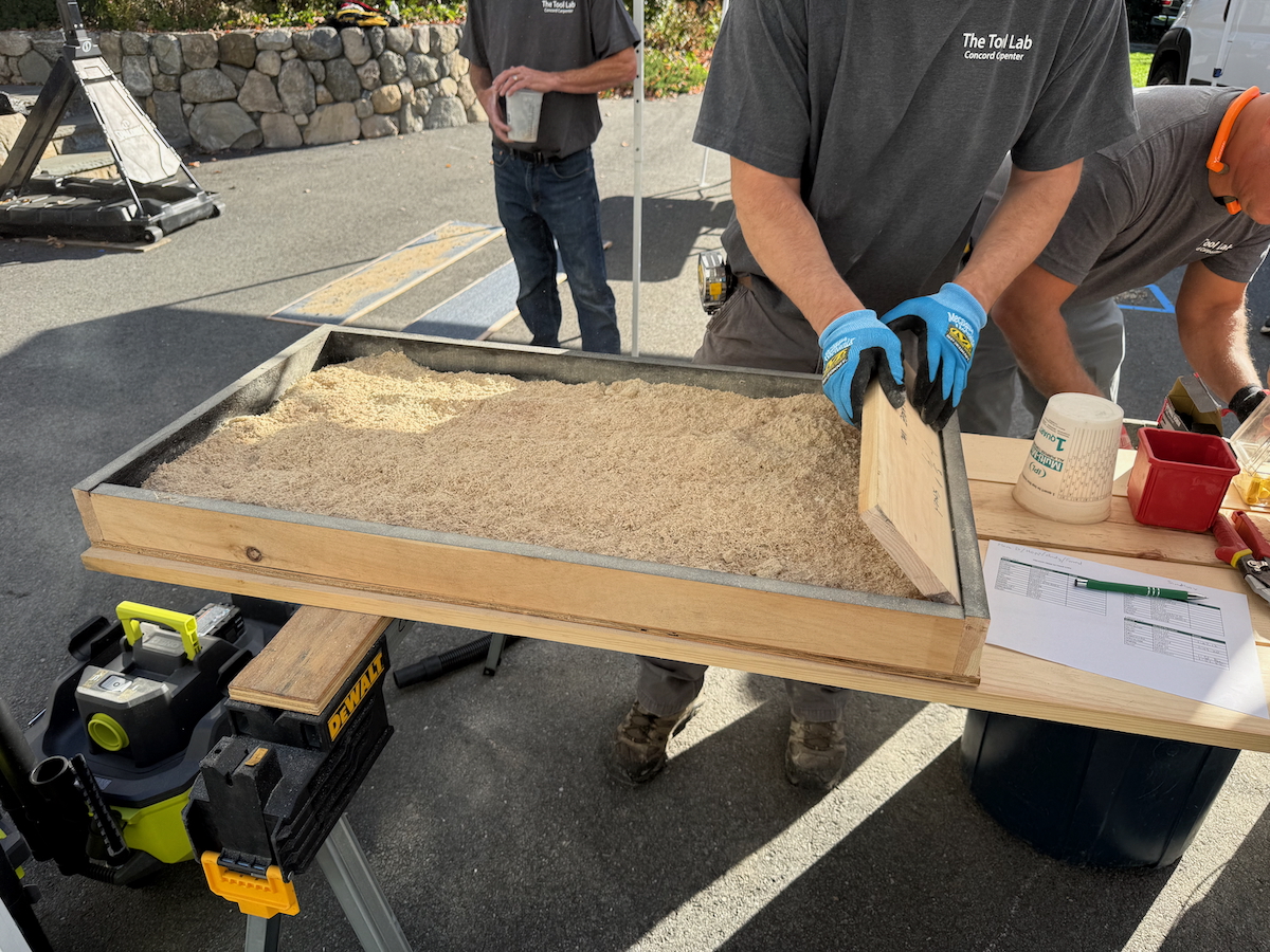 To simulate real-world job site debris, we constructed a sawdust box using 2 gallons of fine sawdust and added additional job site debris material.