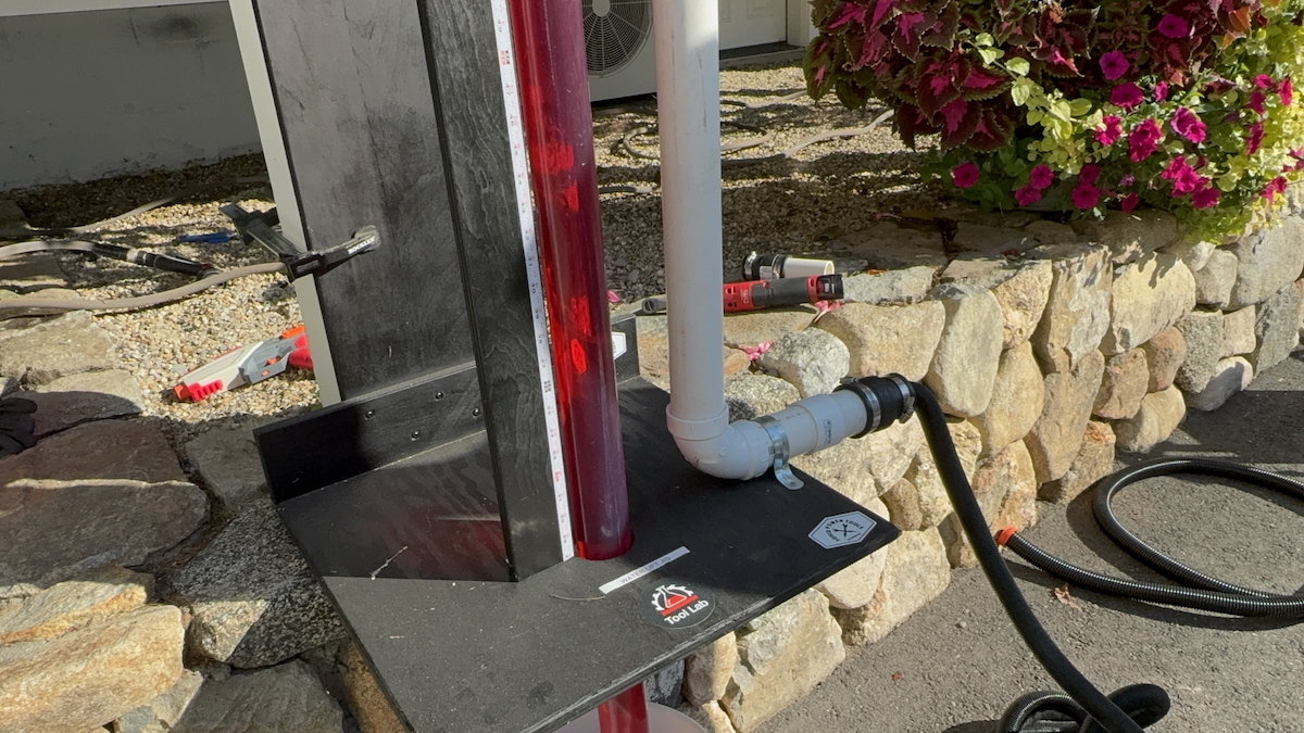 Static suction was measured using a custom-built water column jig—a transparent PVC tube filled with colored water. This setup gives us both a clear visual comparison and a solid data point on each vacuum’s suction performance. All vacuums were tested with their supplied hoses at full power, with auto-clean functions disabled when possible.