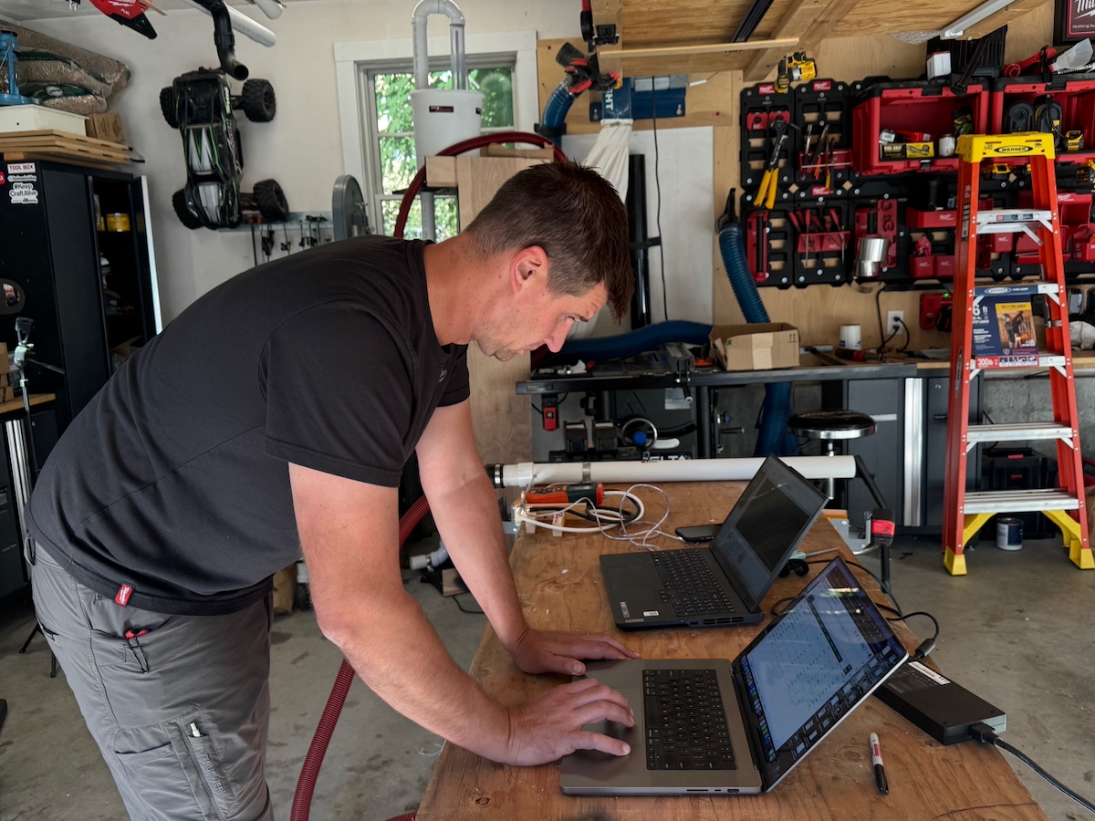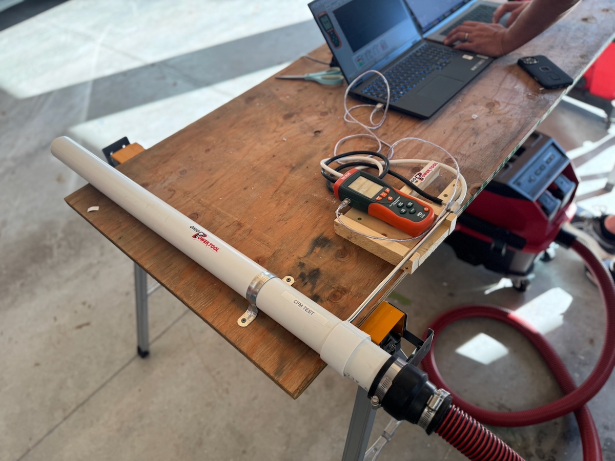 CFM is critical for real-world performance and OSHA silica compliance. To measure airflow, we used a commercial-grade Pitot tube anemometer mounted in a custom jig built from 2” PVC that positioned the probe in the center of the airflow path.