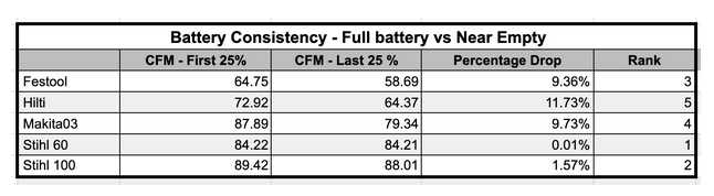 Instead, we focused on performance consistency. We compared CFM from the first 25% of battery drain to the last 25% to calculate the percentage drop. This better reflects real-world cleaning performance as the battery depletes.