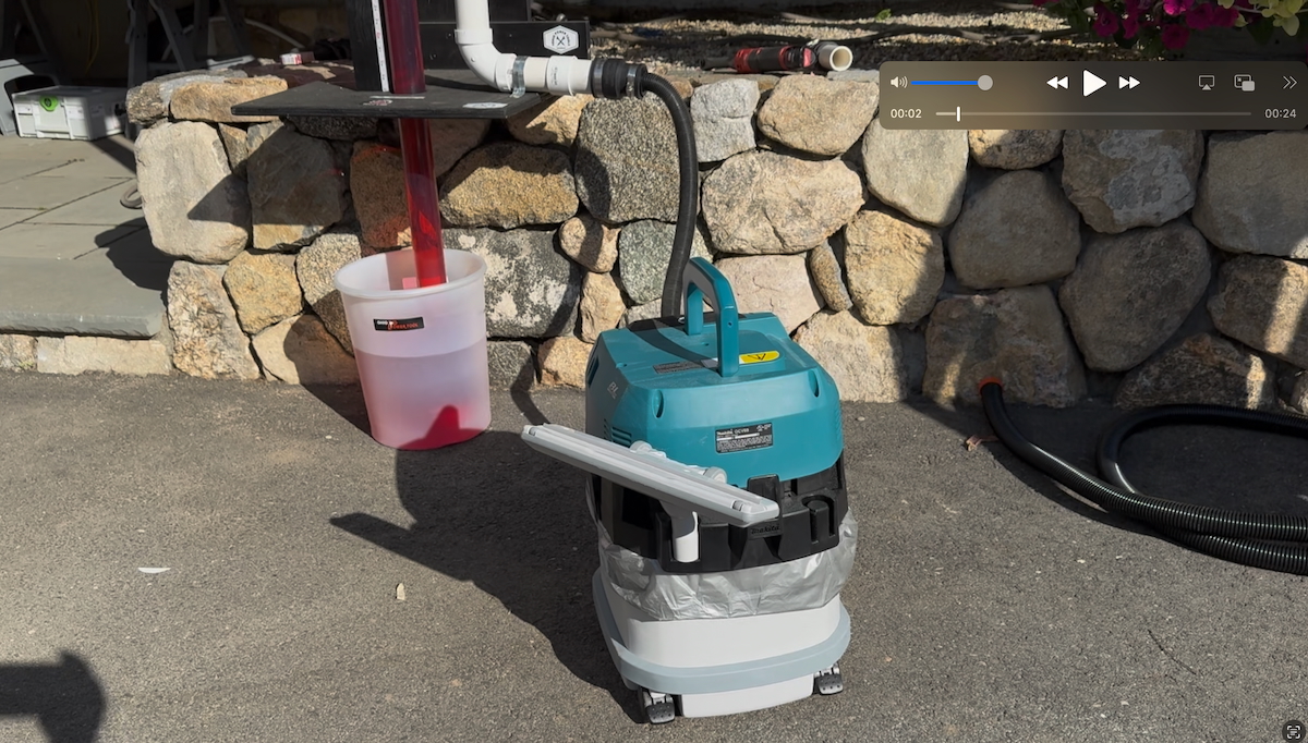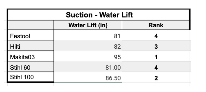 After completing the “Dust-Box” test, each vacuum was immediately retested on the Water Column Jig to measure how much suction was lost as a direct result of a dirty, clogged, or partially restricted filter. This step gives us a true picture of how well each vacuum maintains performance under real job site conditions—because no vacuum runs with a perfectly clean filter for long.