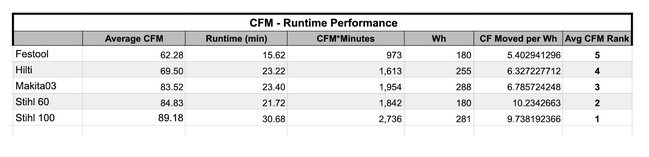 - Makita placed third at 83.52 CFM.