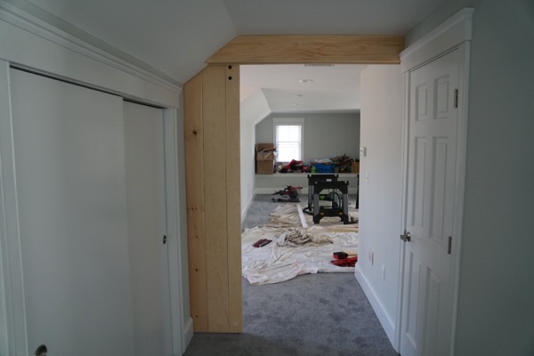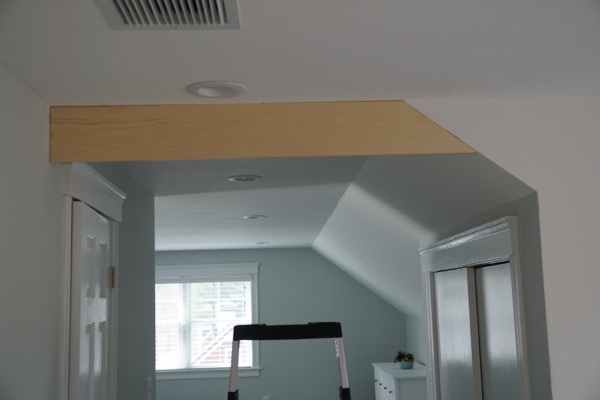 We added vertical pine jambs on the walls under both sides of the soffit to cover any gaps or seams around the door.