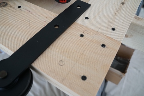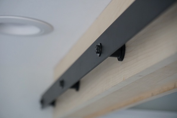 Install your sliding track hardware according to the manufacturer’s instructions. The track manufacturer will specify spacing of the track from the ceiling. This is needed in order to attach (or later remove) the door from the track.