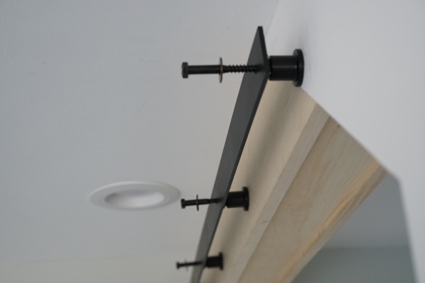 In our situation, we wanted to close off a hallway opening. To mount the track, we had to either use a ceiling mount track or build down the ceiling area. We chose to build the ceiling down, with a soffit. We secured 2×6 boards to the ceiling with TimberLok fasteners to create a soffit with solid blocking for the track hardware to be installed. This built-down soffit allowed us to mount a wall track on the adjoining wall and continue it through the open hallway. Because the door was wide, we had to order two lengths of track and join them on the wall.