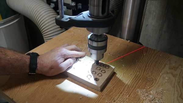 Once the glue has cured, I cut four Oak plugs with a plug cutter and my drill press. I glue and insert the plugs trying my best to match the plug wood grain to the leg grain, and later using a chisel to cut flush.