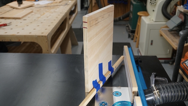- I used a blue table on the router table and then use a scrap block and draw reference marks at the front and rear edges of the router wing cutters