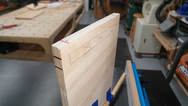 I wanted the stool top to have a ¾” overhang on all sides of the legs. To do this I laid the top, bottom-up, and mark your two hidden dados. The hidden dado stops 3/4″ on each side. The leg tapers from 9 to 7-1/2″