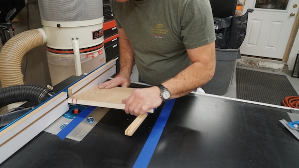 For stool stability, I designed the legs to angle out slightly. To determine the leg angle and angled dado I taped a ½” shim on the opposite dado.