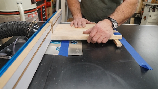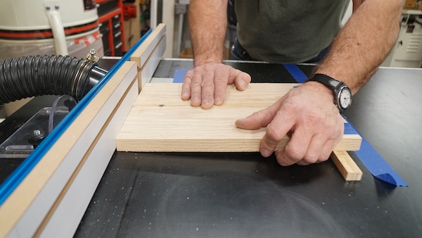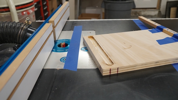- Blue tape is used to secure a ½ inch strip of wood on the dado location, opposite the board router bit.