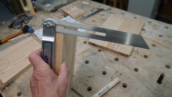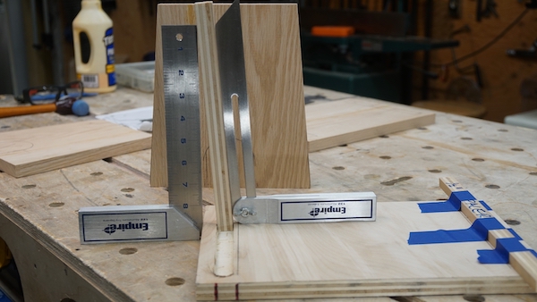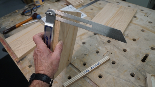 This took some trial and error with scrap wood. A ½ shim gave me a 5-degree leg angle which seemed right.