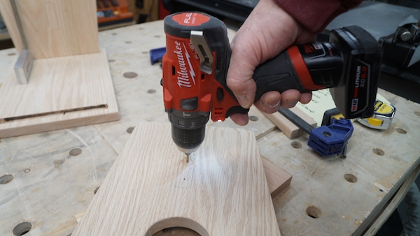 Each leg will have two screws securing them to the stretcher. I used a countersink to create a hole big enough to insert an Oak plug to hide the screws. Final assembly involves gluing the leg to stool top dado, installing fasteners into the stretcher, and clamping the top to the legs.