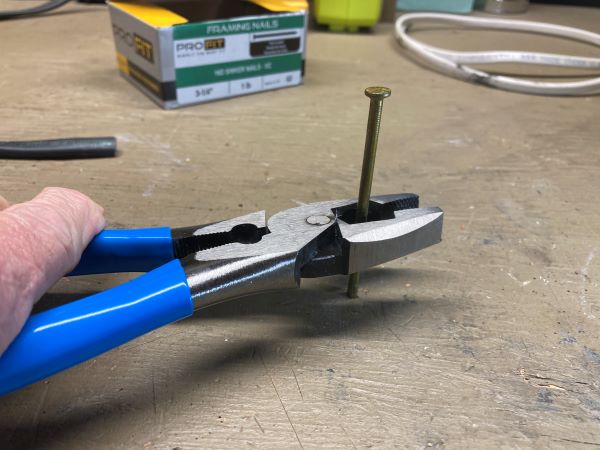 It was no surprise that the larger, longer lineman’s cut romex more easily. While effort is subjective, I found that in cutting thru both 14/2 and 12/2 romex I had to exert about 50% more effort with the smaller combination pliers. While the 369 lineman’s are rated to cut ACSR, ACSR is not something that a lot of electricians run into often (it’s more of an actual lineman’s thing). But we all run into the occasional nail that needs to be cut out of the way. To pick a difficult case, I tried both pliers out on 16d sinkers. The 9.5-inch lineman cut them (using both hands), while I couldn’t get the 348 combination pliers to cut through. (To be fair, I’m not as strong as I used to be, and my hands are a bit arthritic these days.)